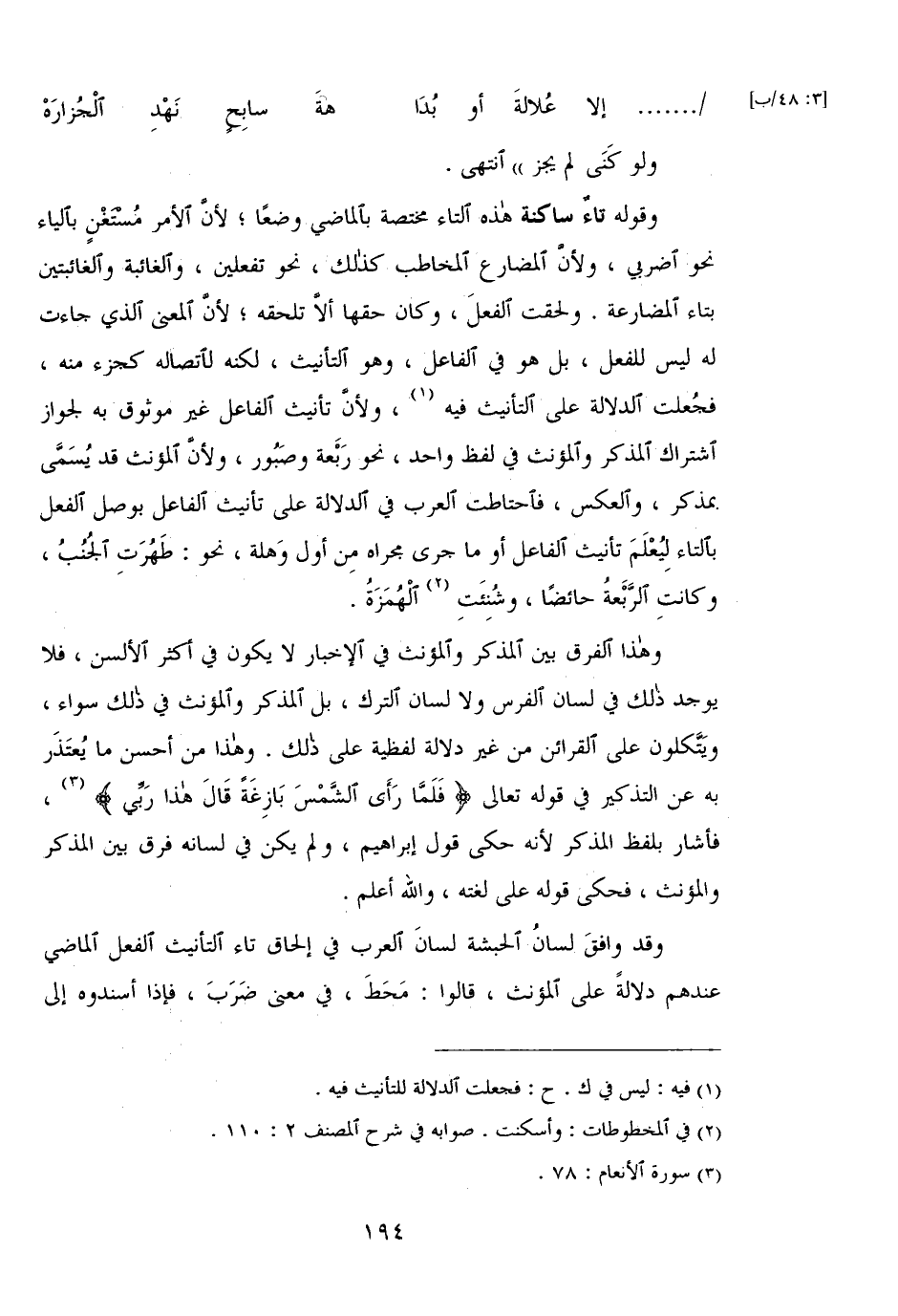 وهذا الفرق بين المذكر والمؤنث في الإخبار لا يكون في أكثر الألسن، فلا يوجد ذلك في لسان الفرس ولا لسان الترك، بل المذكر والمؤنث في ذلك سواء، ويتكلون على القرائن من غير دلالة لفظية على ذلك. وهذا من أحسن ما يعتذر به عن التذكير في قوله تعالى {فَلَمَّا رَأَى الشَّمْسَ بَازِغَةً قَالَ هَذَا رَبِّي}، فأشار بلفظ المذكر لأنه حكى قول إبراهيم، ولم يكن في لسانه فرق بين المذكر والمؤنث، فحكى قوله على لغته، والله أعلم.