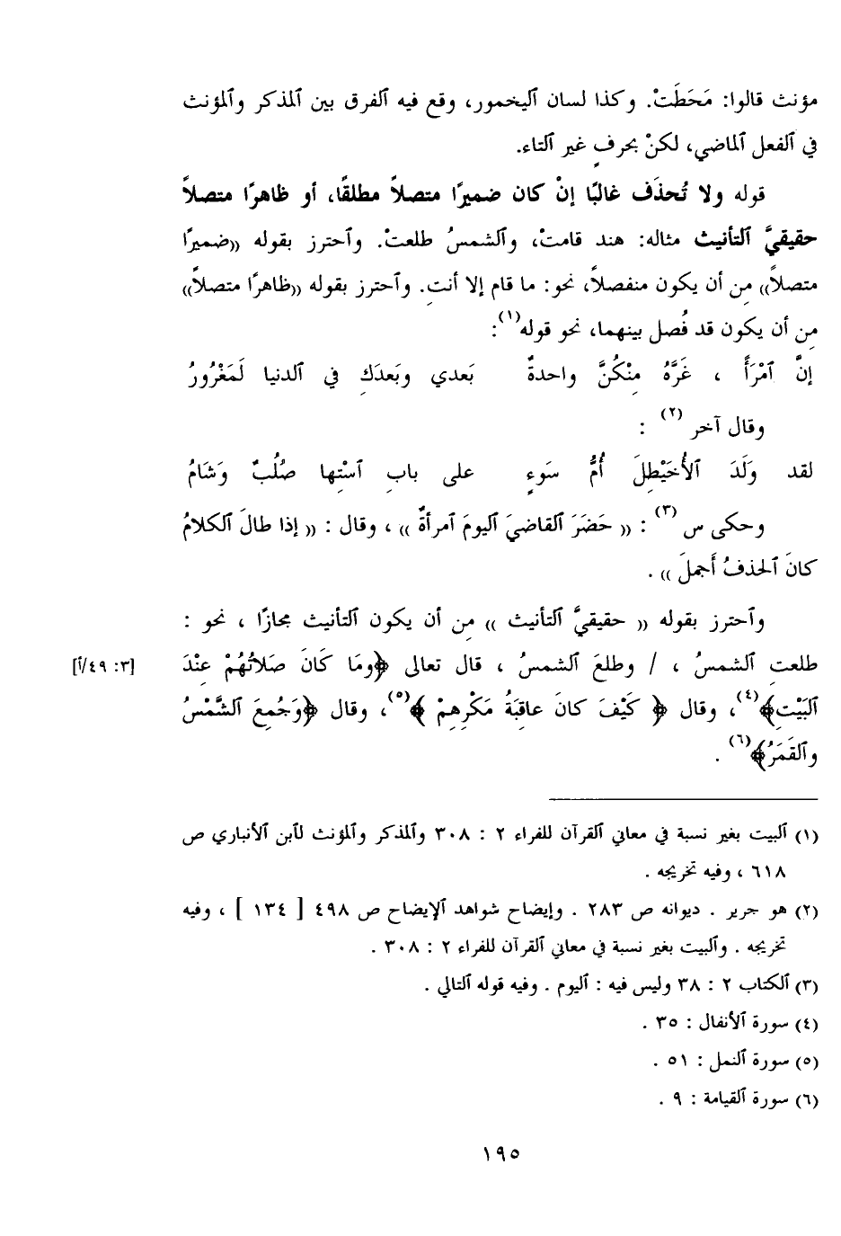 واحترز بقوله "حقيقي التأنيث" من أن يكون التأنيث مجازًا، نحو: طلعت الشمس، /وطلع الشمس، قال تعالى {ومَا كَانَ صَلاتُهُمْ عِندَ البَيْتِ}، وقال {كَيْفَ كَانَ عَاقِبَةُ مَكْرِهِمْ}، وقال {وجُمِعَ الشَّمْسُ والْقَمَرُ}.