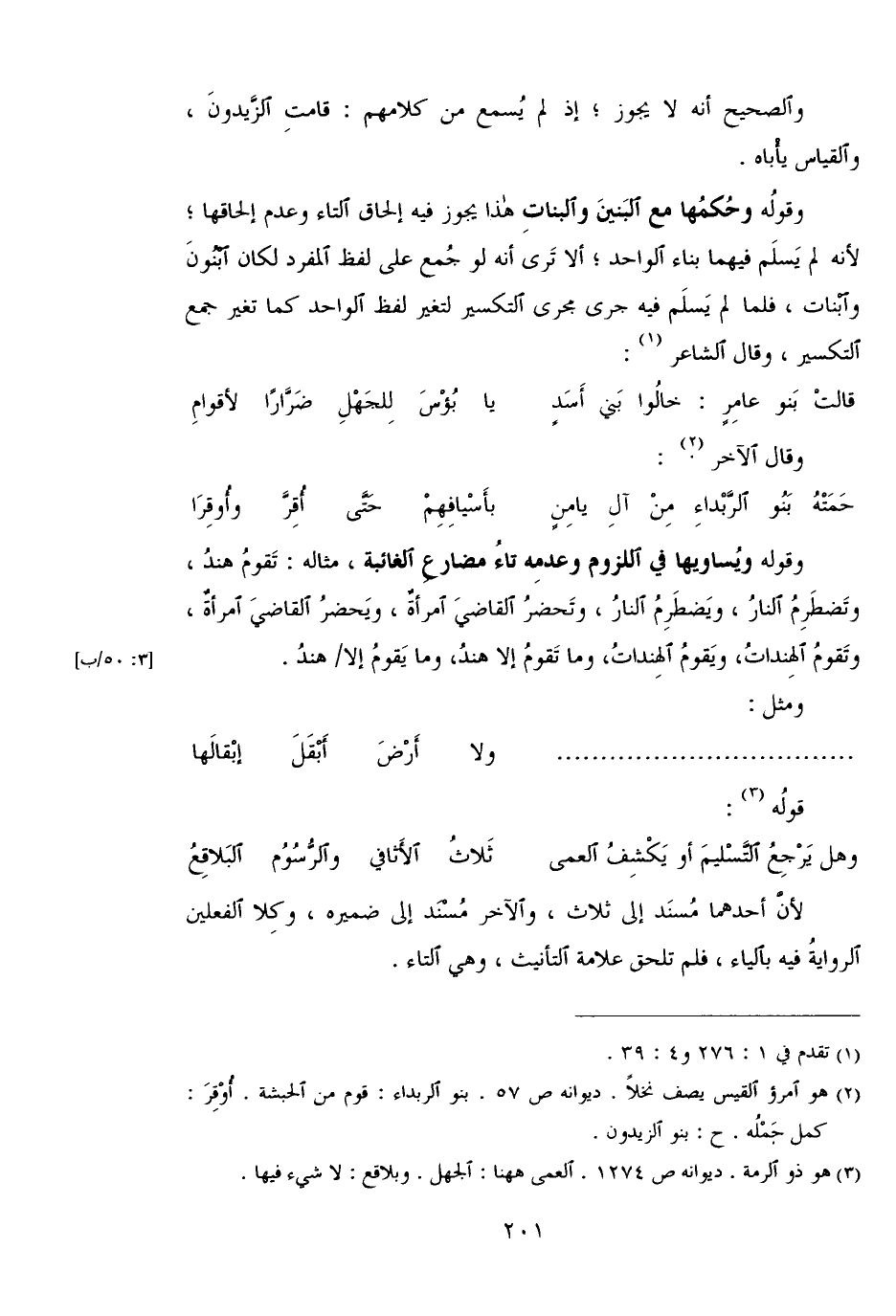 وقوله وحكمها مع البنين والبنات وهذا يجوز فيه إلحاق التاء وعدم إلحاقها؛ لأنه لم يسلم فيهما بناء الواحد؛ ألا ترى أنه لو جمع على لفظ المفرد لكان ابنون وابنات، فلما لم يسلم فيه جرى مجرى التكسير لتغيير لفظ الواحد كما تغير جمع التكسير، وقال الشاعر: