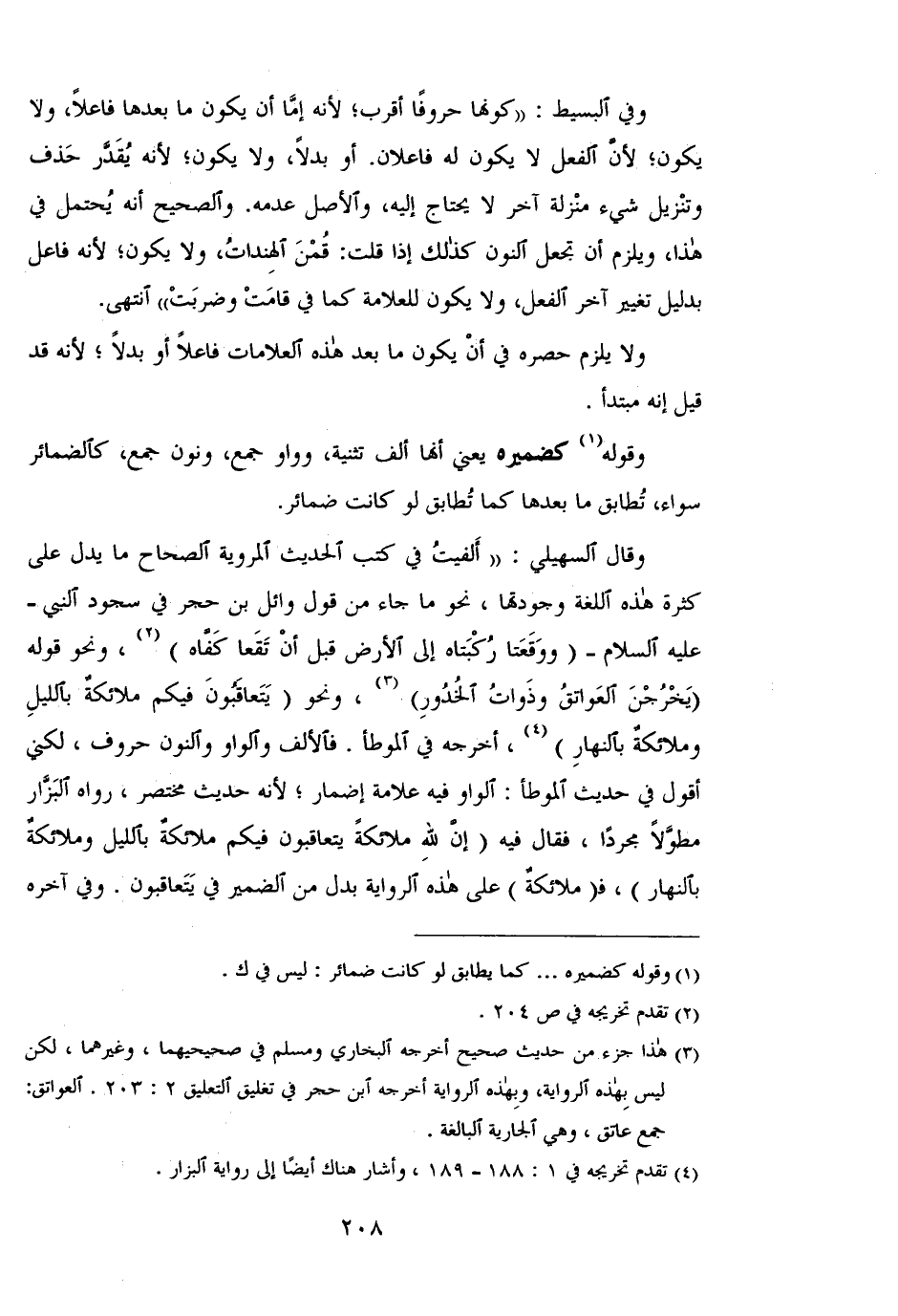 وقال السهيلي: "ألفيت في كتب الحديث المروية الصحاح ما يدل على كثرة هذه اللغة وجودتها، نحو ما جاء من قول وائل بن حجر في سجود النبي -عليه السلام- (ووقعتا ركبتاه إلى الأرض قبل أن تقعا كفاه)، ونحو قوله (يخرجن العواتق وذوات الخدور)، ونحو (يتعاقبون فيكم ملائكة بالليل وملائكة بالنهار)، أخرجه في الموطأ. فالألف والواو والنون حروف، لكني أقول في حديث الموطأ: الواو فيه علامة إضمار؛ لأنه حديث مختصر، رواه البزار مطولًا مجردًا، فقال فيه (إن لله ملائكة يتعاقبون فيكم ملائكة بالليل وملائكة بالنهار)، فـ (ملائكة) على هذه الرواية بدل من الضمير في يتعاقبون. وفي آخره