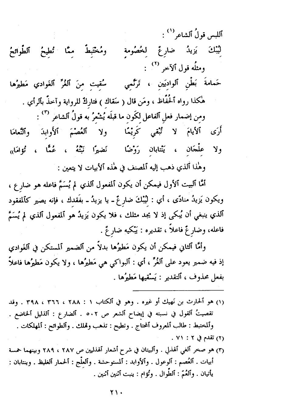 أما البيت الأول فيمكن أن يكون المفعول الذي لم يسم فاعله هو ضارع، ويكون يزيد منادى، أي: لبيك ضارعٌ -يا زيد- بفقدك، فإنه يصير كالمفقود الذي ينبغي أن يبكى إذ لا يجد مثلك، فلا يكون يزيد هو المفعول الذي لم يسم فاعله، وضارعٌ فاعلًا، تقديره: يبكيه ضارعٌ.