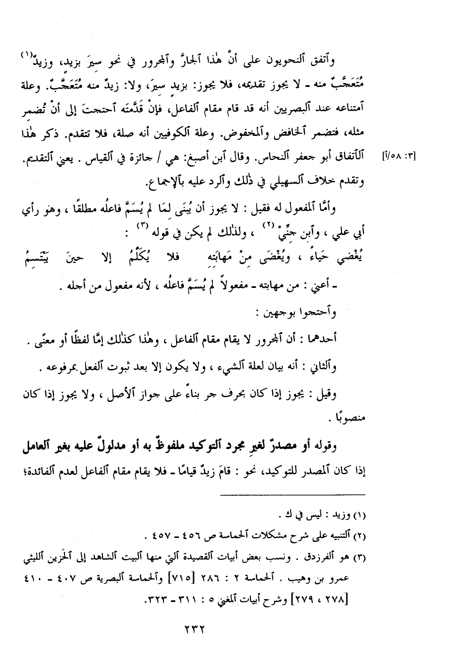 واتفق النحويون على أن هذا الجار والمجرور في نحو سير بزيد، وزيد متعجب منه - لا يجوز تقديمه، فلا يجوز: يزيد سير، ولا: زيد منه متعجب. وعلة امتناعه عند البصريين أنه قد قام مقام الفاعل، فإن قدمته احتجت إلى أن تضمر مثله، فتضمر الخافض والمخفوض. وعلة الكوفيين أنه صلة، فلا تتقدم. ذكر هذا الاتفاق أبو جعفر النحاس. وقال ابن اصبغ: هي/ جائزة في القياس. يعني التقدم. وتقدم خلاف السهيلي في ذلك والرد عليه بالإجماع.