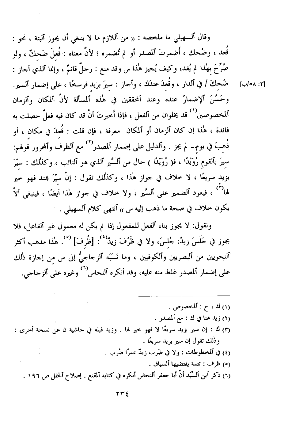 وقال السهيلي ما ملخصه: "من اللازم ما لا ينبغي أن يجوز البتة، نحو: قعد، وضحك، أضمرت المصدر أو لم تضمره؛ لأن معناه: فعل ضحك، ولو صرح بهذا لم يفد، وكيف يحيز هذا س وقد منع: رجل قائم، إنما الذي أجاز: ضحك/ في الدار، وقعد عندك، وأجاز: سير بزيد فرسخًا، على إضمار السير. وحسن الإضمار عنده وعند المحققين في هذه المسألة لأن المكان والزمان المخصوصين قد يخلوان من الفعل، فإذا أخبرت أن قد كان فيه فعل حصلت به فائدة، هذا إن كان الزمان أو المكان معرفة، فإن قلت: قعد في مكان، أو ذهب في يوم - لم يجز. والدليل على إضمار المصدر مع الظرف والمجرور قولهم: سير بالقوم رويدًا، فـ (رويدًا) حال من السير الذي هو النائب، وكذلك: سير يزيد سريعًا، لا خلاف في جواز هذا، وكذلك تقول: إن سير بهند فهو خير لها، فيعود الضمير على السير، ولا خلاف في جواز هذا أيضًا، فينبغي ألا يكون خلاف في صحة ما ذهب إليه س" انتهى كلام السهيلي.
