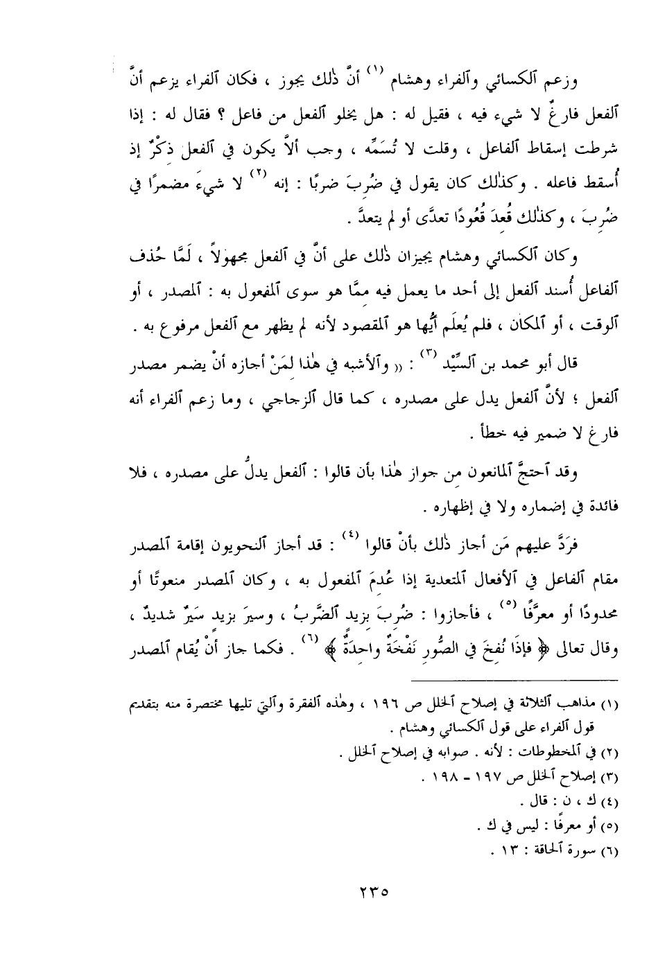 وزعم الكسائي والفراء وهشام أن ذلك يجوز، فكان الفراء يزعم أن الفعل فارغ لا شيء فيه، فقيل له: هل يخلو الفعل من فاعل؟ فقال له: إذا شرطت إسقاط الفاعل، وقلت لا تسمه، وجب ألا يكون في الفعل ذكر إذا أسقط فاعله. وكذلك كان يقول في ضرب ضربًا: إنه لا شيء مضمرًا في ضرب، وكذلك قعد قعودًا تعدى أو لم يتعد.