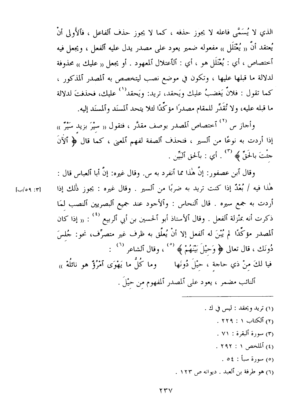 وأجاز س اختصاص المصدر بوصف مقدر، فتقول "سير بزيد سير" إذا أردت به نوعًا من السير، فتحذف الصفة لفهم المعنى، كما قال {الآنَ جِئْتَ بِالْحَقِّ} أي: بالحق البين. وقال ابن عصفور: إن هذا مما انفرد به س. وقال غيره: إن أبا العباس قال: هذا فيه/ بعد إذا كنت تريد به ضربًا من السير. وقال غيره: يجوز ذلك إذا أردت به جمع سيره. قال النحاس: والأجود عند جميع البصريين النصب لما ذكرت أنه بمنزلة الفعل. وقال الأستاذ أبو الحسين بن أبي الربيع: "إذا كان المصدر مؤكدًا لم يبن له الفعل إلا أن يعلق به ظرف غير متصرف، نحو: جلس دونك، قال تعالى {وَحِيلَ بَيْنَهُمْ}، وقال الشاعر: