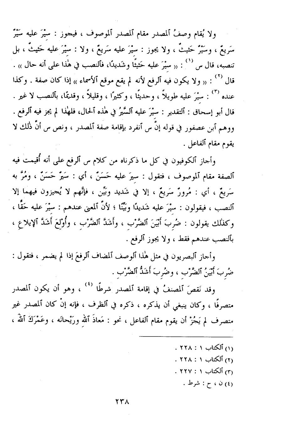 وأجاز الكوفيون في كل ما ذكرناه من كلام س الرفع على أنه أقيمت فيه الصفة مقام الموصوف، فتقول: سير عليه حسن، أي: سير حسن، ومر به سريع، أي: مرور سريع، إلا في شديد وبين، فإنهم لا يجيزون فيهما إلا النصب، فيقولون: سير عليه شديدًا وبينًا؛ لأن المعنى عندهم: سير عليه حقًا، وكذلك يقولون: ضرب أبين الضرب، وأشد الضرب، وأولع أشد الإيلاع، بالنصب عندهم فقط، ولا يجوز الرفع.