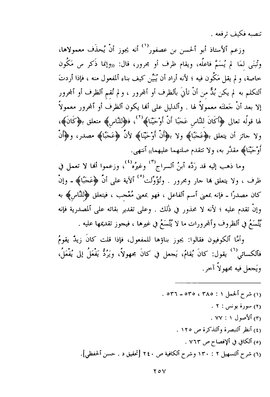 وزعم الاستاذ أبو الحسن بن عصفور أنه يجوز أن يحذف معمولًا ها، وتبني لما لم يسم فاعله، ويقام ظرف أو مجرور، قال: "وإنما ذكر س مكون خاصة، ولم يقل مكون فيه؛ لأنه أراد أن يبين كيف بناء المفعول منه، فإذا أردت التكلم به لم يكن بد من أن تأتي بالظرف أو المجرور، ولم تقم الظرف أو المجرور إلا بعد أن جعلته معمولًا لها. والدليل على أنها يكون الظرف أو المجرور معمولًا لها قوله تعالى (أَكَانَ لِلنَّاسِ عَجَبًا أَنْ أَوْحَيْنَا)، فـ (لِلنَّاسِ) متعلق بـ (كَان)، ولا جائز أن يتعلق بـ (عَجَبًا) ولا بـ (عَجَبًا) مصدر، و (أَنْ أَوْحَيْنَا) مقدر به، ولا تتقدم صلتها عليهما" انتهى.