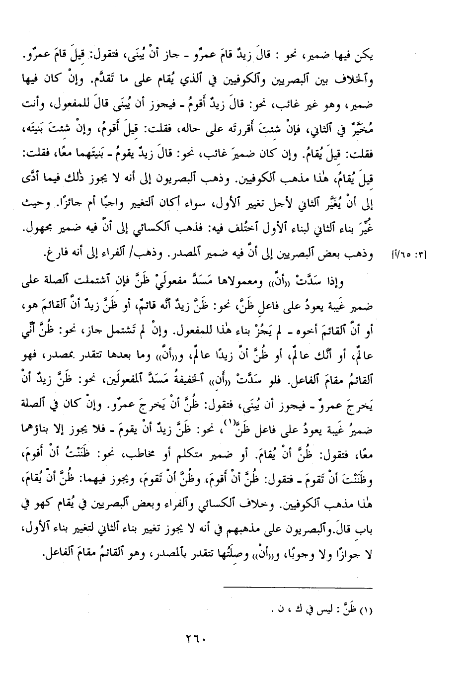 وإذا سدت "أن" ومعمولا لها مسد مفعولي ظن فإن اشتملت الصلة على ضمير غيبة يعود على فاعل ظن، نحو: ظن زيد أنه قائم، أو ظن زبد أن القائم هو، أو أن القائم أخوه- لم يجز بناء هذا للمفعول. وإن لم تشتمل جاز، نحو: ظن أني عالم، أو أنك عالم، أو ظن أن زيدًا عالم، و"أن: وما بعدها تتقدر بمصدر، فهو القائم مقام الفاعل. فلو سدت "أن" الخفيفة مسد المفعولين، نحو: ظن زيد يخرج عمرو- فيجوز أن يبني، فتقول: أظن أن يخرج عمرو. وإن كان في الصلة ضمير غيبة يعود على فاعل ظن، نحو: ظن زيد أن يقوم- فلا يجوز إلا بناؤهما معًا، فتقول: ظن أن يقام. أو ضمير متكلم أو مخاطب، نحو: ظننت أن أقوم، وظننت أن تقوم- فتقول: ظن أن أقوم، وظن أن تقوم، ويجوز فيهما: ظن أن يقام، هذا مذهب الكوفيين. وخلاف الكسائي والفراء وبعض البصريين في يقام كهو في باب قال. والبصريون على مذهبهم في أنه لا يجوز تغيير بناء الثاني لتغيير بناء الأول، لا جوزًا ولا وجوبًا، و"أن" وصلتها تتقدر بالمصدر، وهو القائم مقام الفاعل.