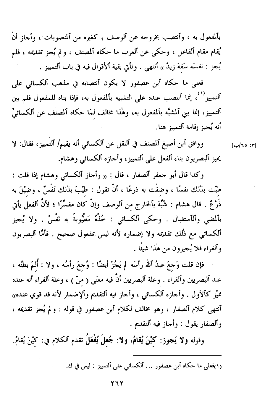 وكذا قال أبو جعفر الصفار، قال: "وأجاز الكسائي وهشام إذا قلت: طبت بذلك نفسًا، وضقت ذرعًا، أن تقول" طيب بذلك نفس، وضيق به ذرع. قال هشام: شبه بالخارج من الوصف وإن كان مفسرًا؛ لأن الفعل يأتي بالمضي والاستقبال. وحكي الكسائي: خذه مطوية به نفس. ولا يجيز الكسائي مع ذلك تقديمه ولا إضماره لأنه ليس بمفعول صحيح. فأما البصريون والفراء فلا يجيزون من هذا شيئًا.
