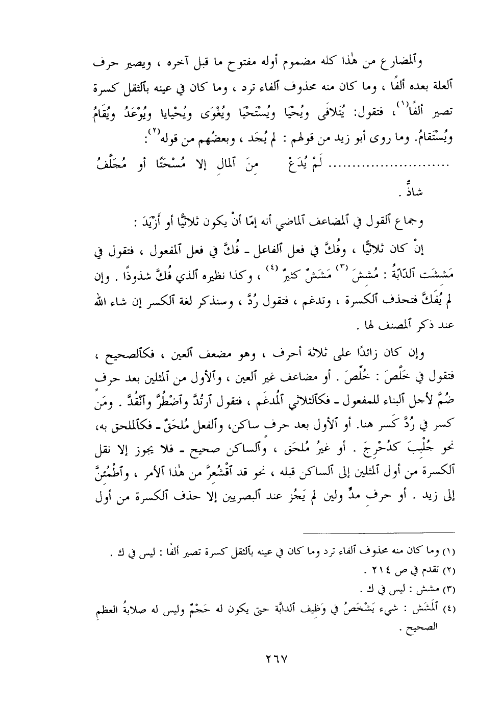 وإن كان زائدًا على ثلاثة أحرف، وهو مضعف العين، فكالصحيح، فتقول في خلص: خلص. أو مضاعف غير العين، والأول من المثلين بعد حرف ضم لأجل البناء للمفعول- فكالثلاثي المدغم، فتقول ارتد واضطر وانقد. ومن كسر في رد كسر هنا. أو الأول بعد حرف ساكن، والفعل ملحق- فكالملحق به، نحو جلبب كدحرج. أو غير ملحق، والساكن الصحيح- فلا يجوز إلا نقل الكسرة من أول المثلين إلى الساكن قبله، نحو قد أقشعر من هذا الأمر، واطمئن إلى زيد. أو حرف مد ولين لم يجز عند البصريين إلا حذف الكسرة من أول