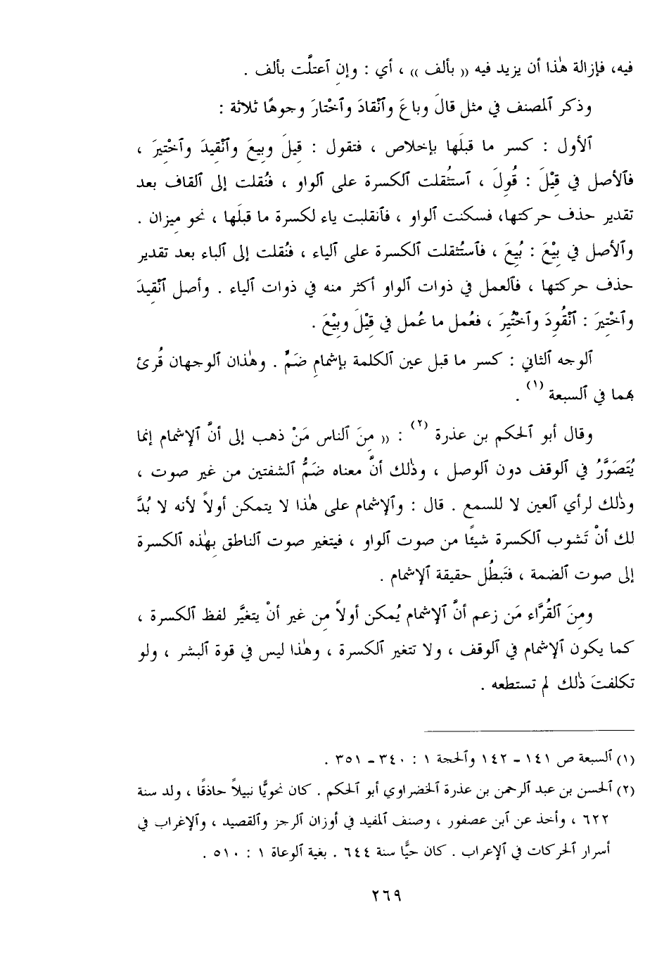 وقال أبو الحكم بن عذرة: "ومن الناس من ذهب إلى أن الإشمام إنما يتصور في الوقف دون الوصل، وذلك أن معناه ضم الشفتين من غير صوت، وذلك لرأي العين لا للسمع. قال: والإشمام على هذا لا يتمكن أولًا لأنه لا بد لك أن تشوب الكسرة شيئًا من صوت الواو، فتغير صوت الناطق بهذه الكسرة إلى صوت الضمة، فتبطل حقيقة الإشمام.
