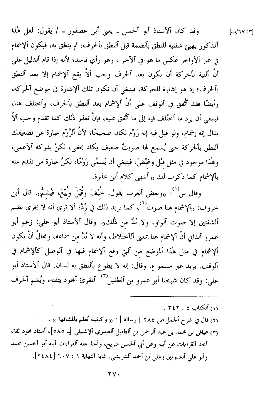وقال س: "وبعض العرب يقول: خيف وقيل وبيع، فيشم". قال ابن خروف: "الإشمام هنا صوت، كما تريد ذلك في رد؛ ألا ترى أنه لا يجري بضم الشفتين إلا صوت الواو، ولا بد منذ لك".وقال الأستاذ أبو علي: زعم أبو عمرو الداني أن الإشمام هنا. بمعنى الاختلاط، وأنه لا بد من سماعه، ومحال أن يكون الإشمام في مثل هذا الموضع من التي وقع الإشمام فيها في الوصل كالإشمام في الوقف. يريد غير مسموع. وقال: إنه لا يطوع بالنطق به لسان. قال الأستاذ أبو علي: وقد كان شيخًا أبو عمرو بن الطفيل المقرئ المجود يتقنه، ويشم الحرف
