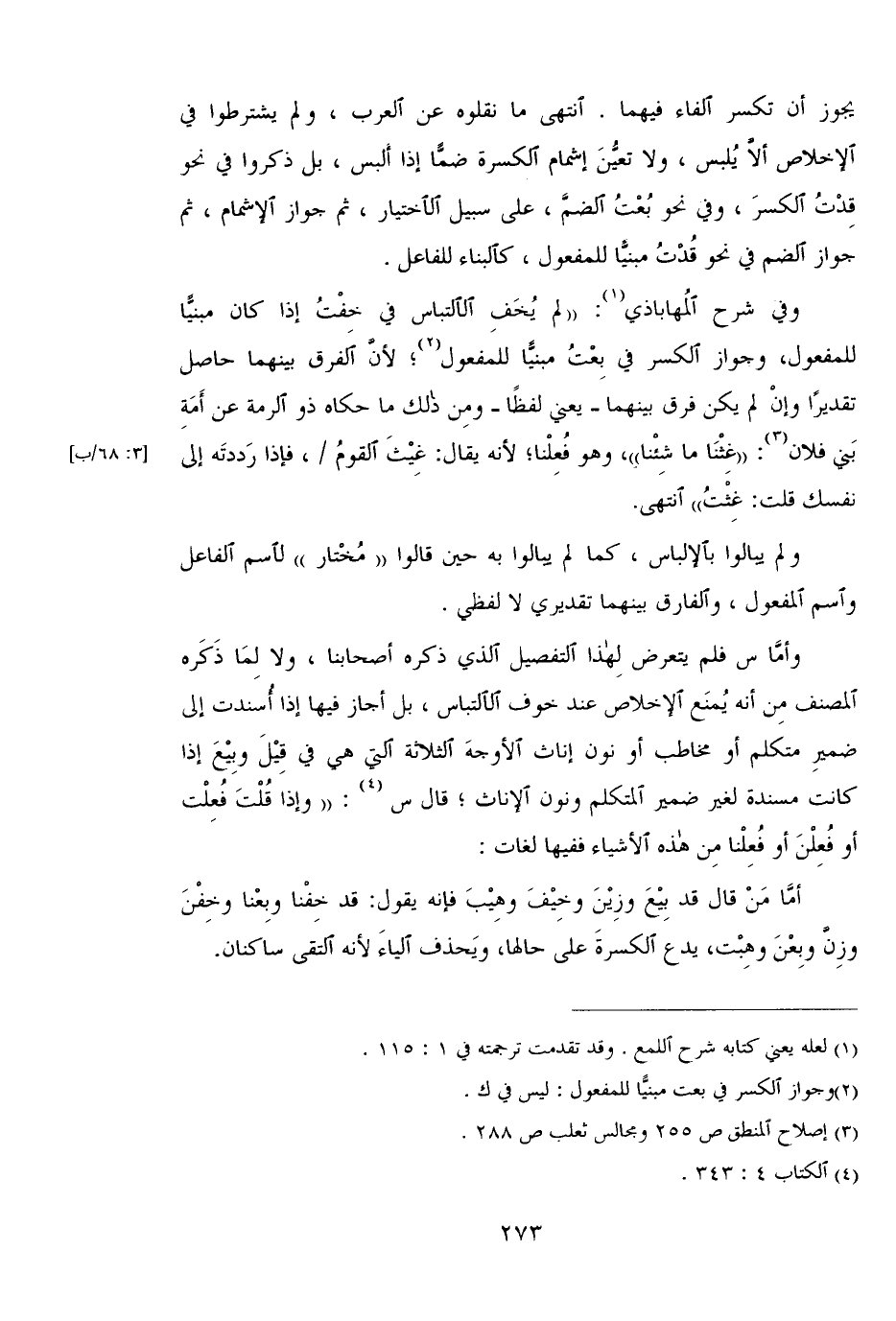 وفي شرح المهاباذي: "لم يخف الالتباس في خفت إذا كان مبنيًا للمفعول، وجواز الكسر في بعت مبنيًا للمفعول؛ لأن الفرق بينهما حاصل تقديرًا وإن لم يكن فرق بينهما- يعني لفظًا- ومن ذلك ما حاكاه ذو الرمة عن أمة بني فلان: "غثنا ما شئنا"، وهو فعلنا؛ لأنه يقال: غبث القوم، فإذا رددته إلى نفسك فلت: غثت" انتهى.