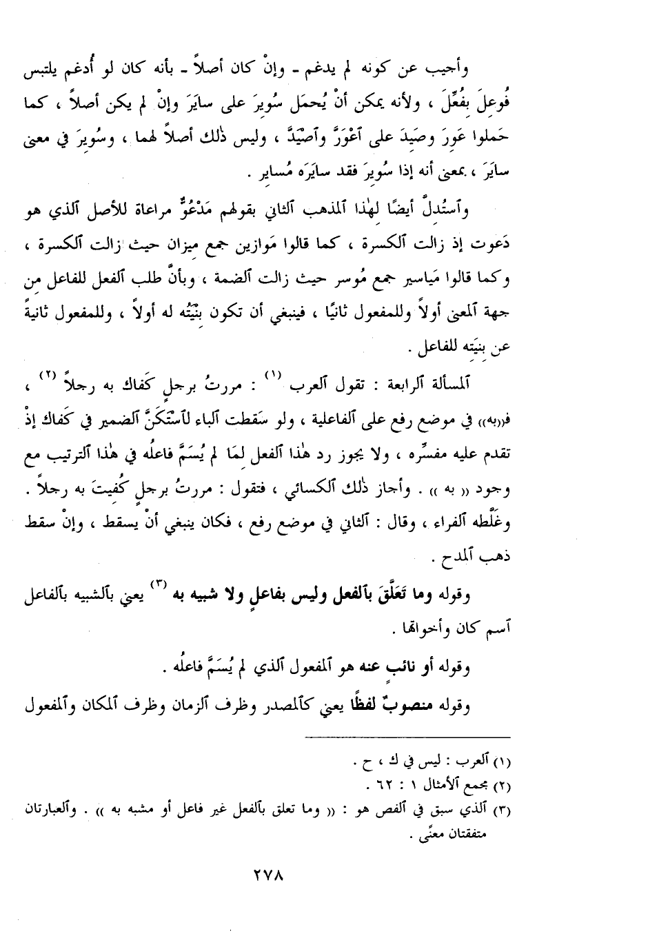 المسألة الرابعة: تقول العرب: مررت برجل كفاك بعه رجلًا، فـ "به" في موضع رفع على الفاعلية، ولو سقطت الباء لاستكن الضمير في كفاك إذ تقدم عليه مفسره، ولا يجوز رد هذا الفعل لما لم يسم فاعله في هذا الترتيب مع وجود "به". وأجاز ذلك الكسائي، فتقول: مررت برجل كفيت به رجلًا. وغلطه الفراء، وقال: الثاني في رفع، فكان ينبغي أن يسقط، وإن سقط ذهب المدح.