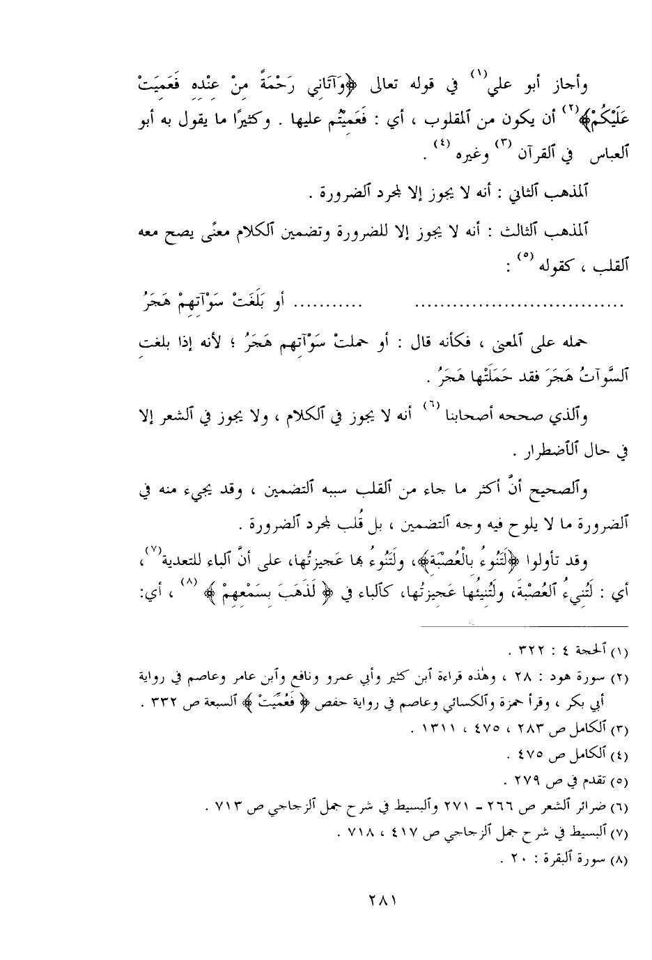 وأجاز أبو علي في قوله تعالى {وآتَانِي رَحْمَةً مِّنْ عِندِهِ فَعُمِّيَتْ عَلَيْكُمْ} أن يكون من المقلوب، أي: فعميتم عليها. وكثيرًا ما يقول به أبو العباس في القرآن وغيره.