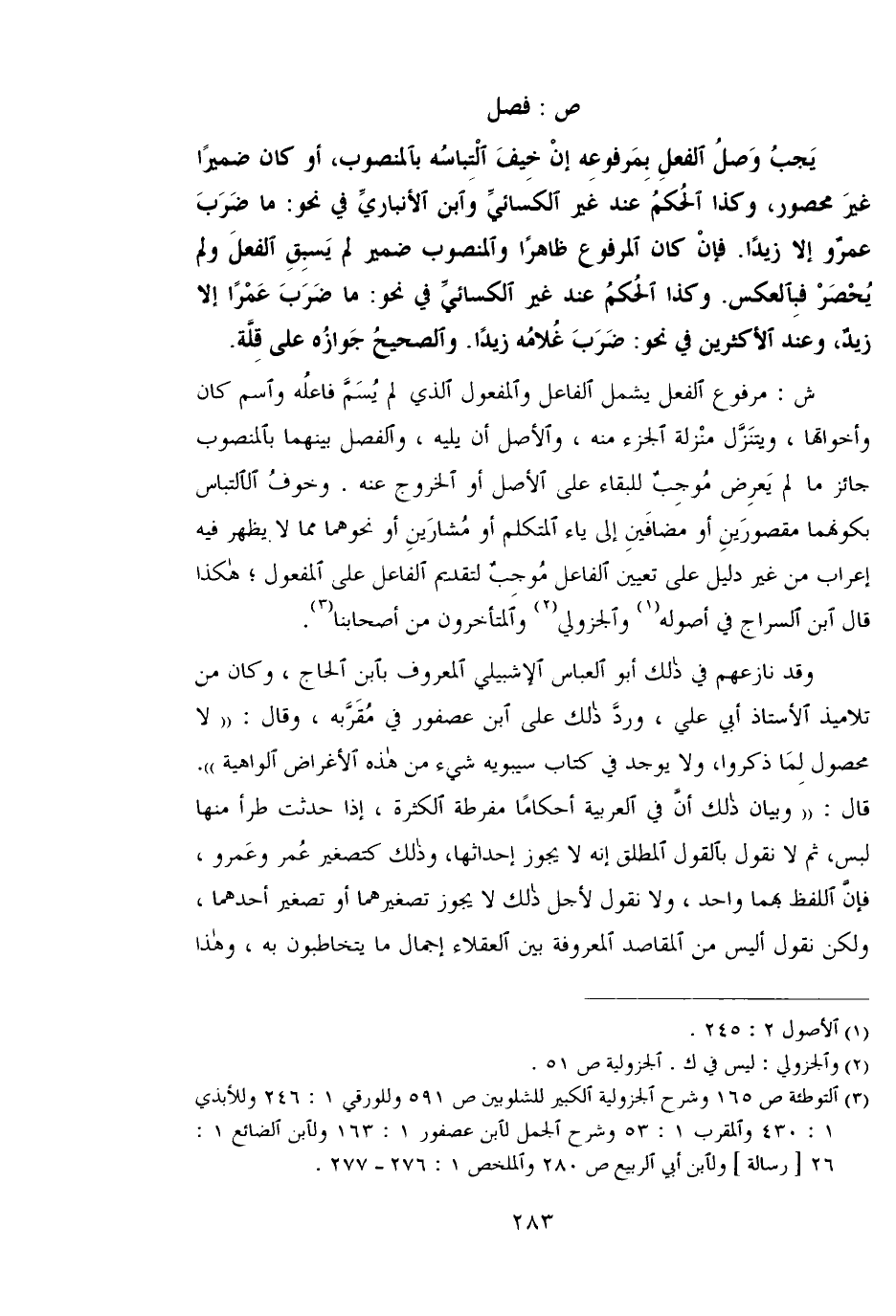 ش: مرفوع الفعل يشمل الفاعل والمفعول الذي لم يسم فاعله واسم كان وأخواتها، ويتنزل منزلة الجزء منه، والأصل أن يليه، والفصل بينهما بالمنصوب جائز ما لم يعرض موجب للبقاء على الأصل أو الخروج عنه. وخوف الالتباس بكونهما مقصورين أو مضافين إلى ياء المتكلم أو مشارين أو نحوهما مما لا يظهر فيه إعراب من غير دليل على تعيين الفاعل موجب لتقديم الفاعل على المفعول؛ هكذا قال ابن السراج في أصوله والجزولي والمتأخرون من أصحابنا.
