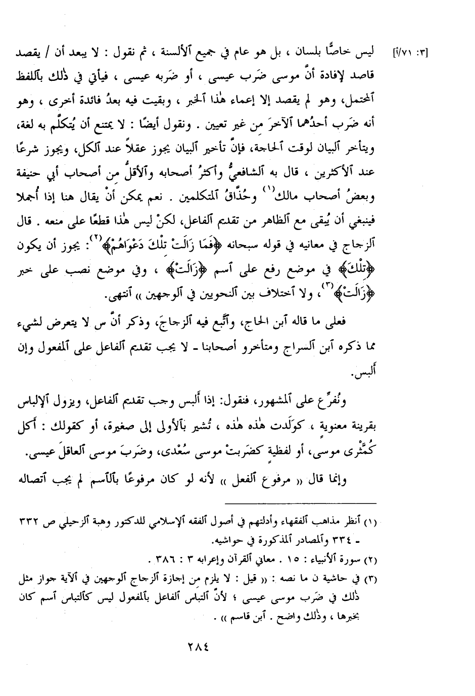 ليس خاصًا بلسان، بل هو عام في جميع الألسنة، ثم نقول: لا يبعد أن /يقصد قاصد لإفادة أن موسى ضرب عيسى، أو ضربه عيسى، فيأتي في ذلك باللفظ المحتمل، وهو لم يقصد إلا إعماء هذا الخبر، وبقيت فيه بعد فائدة أخرى، وهو أنه ضرب أحدهما الآخر من غير تعيين. ونقول أيضًا: لا يمتنع أن يتكلم به لغة، ويتأخر البيان لوقت الحاجة، فإن تأخير البيان يجوز عقلًا عند الكل، ويجوز شرعًا عند الأكثرين، قال به الشافعي وأكثر أصحابه والأقل من أصحاب أبي حنيفة وبعض أصحاب مالك وحذاق المتكلمين. نعم يمكن أن يقال هنا إذا أجملا فينبغي أن يبقي مع الظاهر من تقديم الفاعل، لكن ليس هذا قطعًا على منعه. قال الزجاج في معانيه في قوله سبحانه {فَمَا زَالَت تِّلْكَ دَعْوَاهُمْ}: يجوز أن يكون {تِّلْكَ} في موضع رفع على اسم {زَالَت}، وفي موضع نصب على خبر {زَالَت}، ولا اختلاف بين النحويين في الوجهين" انتهى.