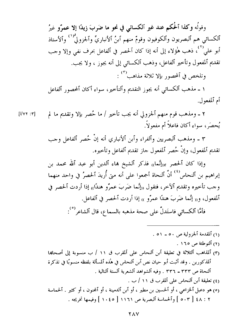 ٢ _ومذهب قوم منهم الجزولي أنه يجب تأخير /ما حصر بالا وتقديم ما لم يحصر، سواء أكان فاعلًا أم مفعولًا.