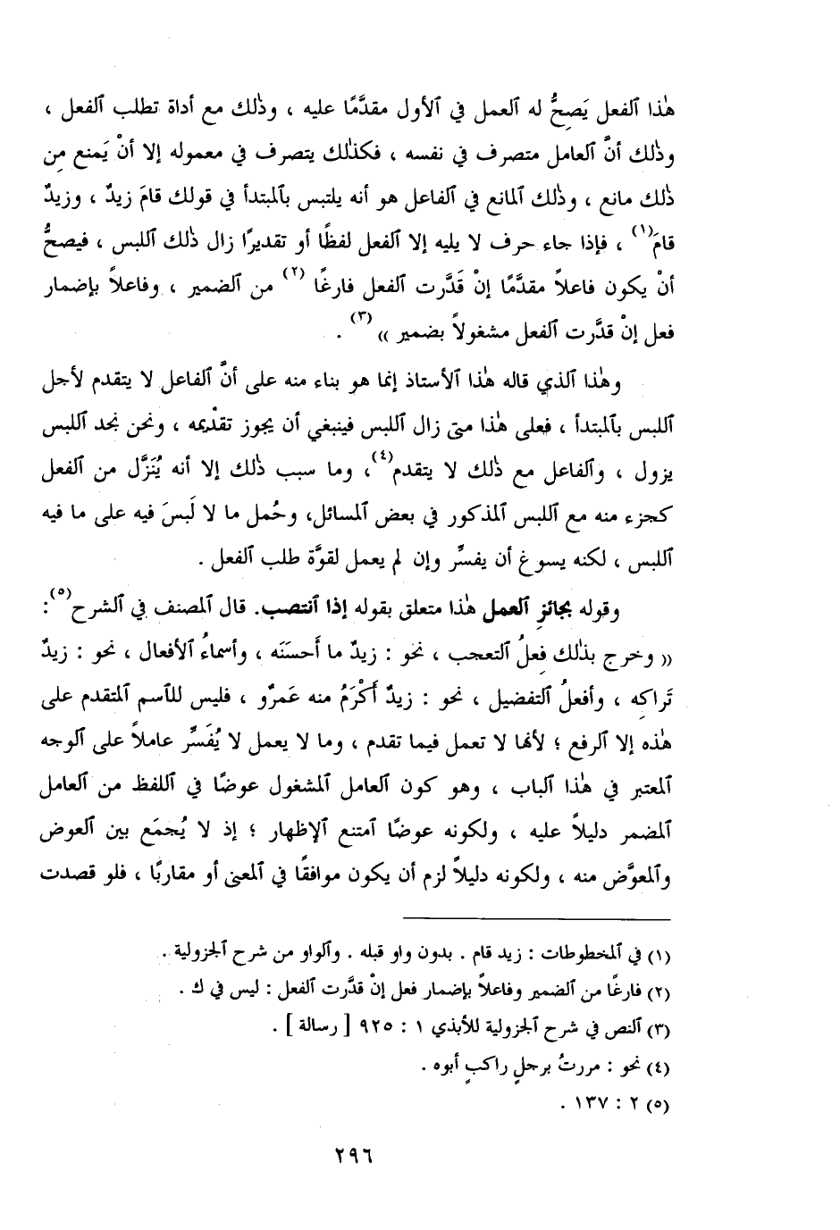 هذا الفعل يصح له العمل في الأول مقدمًا عليه، وذلك مع أداة تطلب الفعل، وذلك أن العامل متصرف في نفسه، فكذلك يتصرف في معمولة إلا أن يمنع من ذلك مانع، وذلك المانع في الفاعل هو أنه يلتبس بالمبتدأ في قولك قام زيد، وزيد قام، فإذا جاء حرف لا يليه إلا الفعل لفظًا أو تقديرًا زال ذلك اللبس، فيصح أن يكون فاعلًا مقدمًا إن قدرت الفعل فارغًا من الضمير، وفاعلًا بإضمار فعل إن قدرت الفعل مشغولًا بضمير".