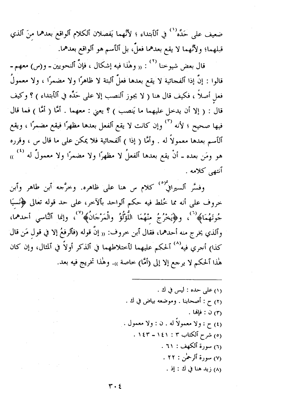 قال بعض شيوخنا: " وهذا فيه إشكال، فإن النحويين - و (س) معهم - قالوا: إن إذا الفجائية لا يقع بعدها فعل البتة لا ظاهرًا ولا مضمرًا، ولا معمول فعل أصلاً، فكيف فال هنا (لا يجوز النصب إلا على حده في الابتداء) وكيف قال: (إلا أن يدخل عليهما ما ينصب) يعنى: معهما. اما (أما) فما قال فيها صحيح؛ لأنه وإن كانت لا يقع الفعل بعدها مظهرًا فيقع مضمرًا، ويقع الاسم بعدها معمولاً له. وأما (إذا) الفجائية فلا يمكن على ما قال س، وقرره هو ومن بعده - أن يقع بعدها الفعل لا مظهرًا ولا مضمرًا ولا معمول له" انتهى كلامه.