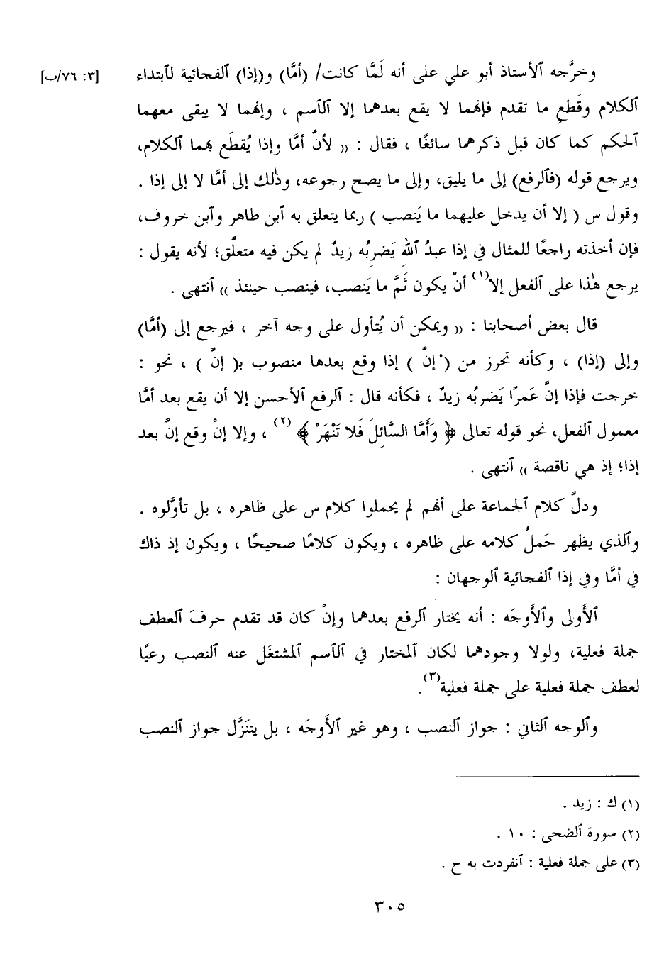 فال بعض أصحابنا: "ويمكن أن يتأول على وجه آخر، فيرجع إلى (أما) وإلى (إذا)، وكأنه تحرز من (إن) إذا وقع بعدها منصوب بـ (إن)، نحو: خرجت فإذا إن عمرًا يضربه زيد، فكأنه قال: الرفع الأحسن إلا أن يقع بعد أما معمول الفعل، نحو قوله تعالى {وَأَمَّا السَّائِلَ فَلا تَنْهَرْ}، وإلا إن وقع إن بعد إذا؛ إذ هى ناقصة" انتهى.