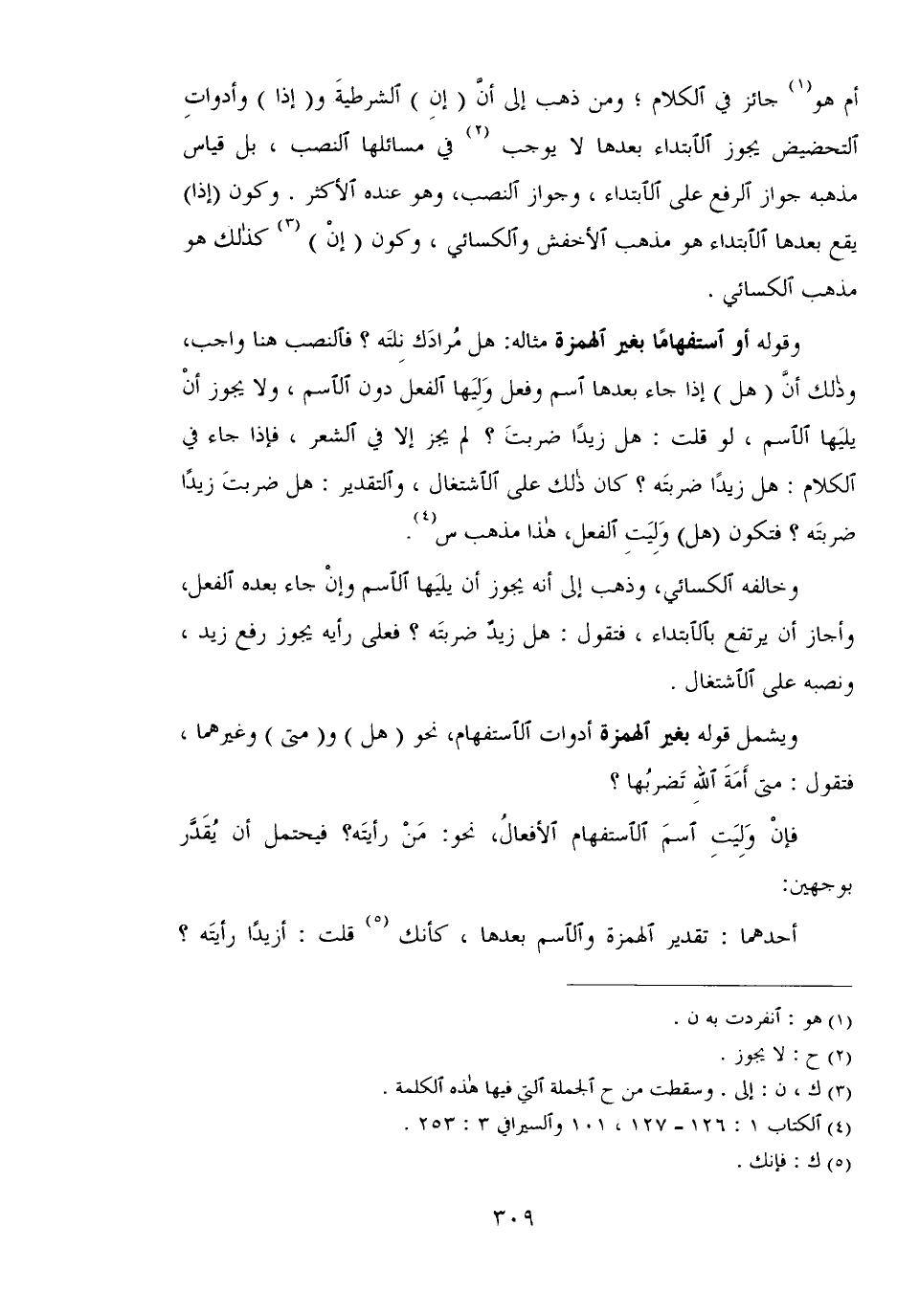 أم هو جائز قي الكلام؛ ومن ذهب إلى أن (إن) الشرطية و (إذا) وأدوات التحضيض يجوز الابتداء بعدها لا يوجب في مسائلها النصب، بل قياس مذهبه جواز الرفع على الابتداء، وجواز النصب، وهو عنده الأكثر. وكون (إذا) يقع بعدها الابتداء هو مذهب الأخفش والكسائي، وكون (إن) كذلك هو مذهب الكسائي.
