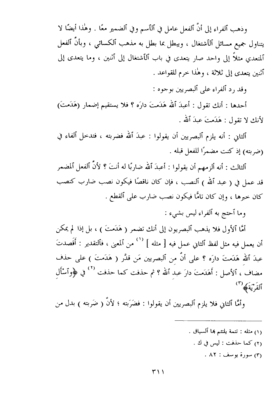 أما الأول فلا يذهب البصريون إلي أنك تضمر (هدمت)، بل إذا لم يمكن أن يعمل فيه مثل لفظ الثاني عمل فيه (مثله) من المعنى، فالتقدير: أقصدت عبد الله هدمت داره؟ على أن من البصريين من قدر (هدمت) على حذف مضاف، الأصل: أهدمت دار عبد الله؟ ثم حذفت في {وَاسْأَلْ الْقَرْيَةَ}، وأما الثاني فلا يلزم البصريين أن يقولوا: فضربته؛ لأن (ضربته) بدل من