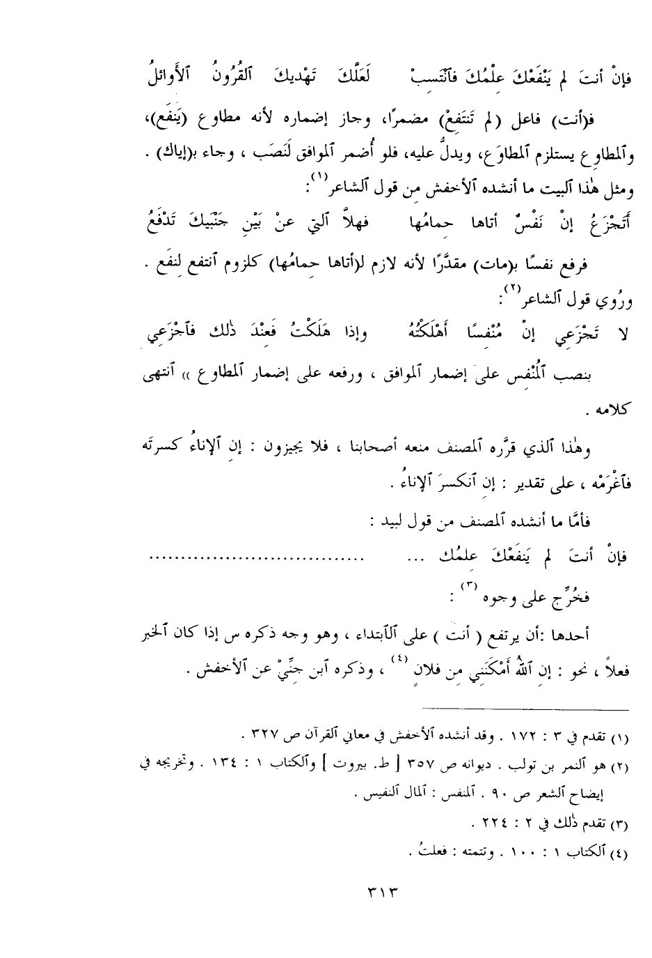 بنصب المنفس على إضمار الموافق، ورفعه على إضمار المطاوع" انتهى كلامه. وهذا الذي قرره المصنف منعه أصحابنا. فلا يجيزون: إن الإناء كسرته فاغرمه، على تقدير: إن انكسر الإناء. فأما ما أنشده المصنف من قول لبيد: فغن أنت لم ينفعك علمك ...............