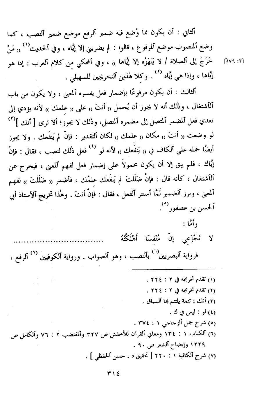 الثالث: أن يكون مرفوعا بإضمار فعل يفسر المعنى، ولا يكون من باب الاشتغال، وذلك أنه لا يحوز أن يحمل"أنت" على"علمك" لأنه يودي إلى تعدي فعل المضمر المتصل إلى مضمره المتصل، وذلك لا يجوز؛ ألا ترى [أنك] لو وضعت "أنت" مكان "علمك" لكان التقدير: فإن لم ينفعك. ولا يجوز ايضًا حمله على الكاف في "ينفعك" لأنه لو فعل ذلك لنصب، فقال: فإن إياك، فلم يبق إلا أن يكون محمولاً على إضمار فعل لفهم المعنى، فيخرج عن الاشتغال، كأنه قال: فإن ضللت لم ينفعك علمك، فأضمر "ضللت" لفهم المعنى، وبرز الضمير لما استتر الفعل، فقال: فإن أنت. وهذا تخريج الأستاذ أبي الحسن بن عصفور. وأما: لا تجزعي إن منفسًا أهلكته فرواية البصريين بالنصب، وهو الصواب. ورواية الكوفيين الرفع،