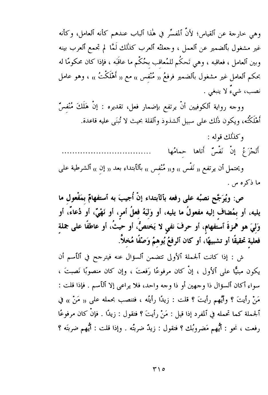 ش: إذا كانت الجملة الأولى تتضمن السؤال عنه فيترجح في الاسم أن يكون مبنيًا على الأول، إن كان مرفوعًا رفعت، وإن كان منصوبًا نصبت، سواء أكان السؤال ذا وجهين أو ذا وجه واحد، فلا يراعى إلا الاسم. فإذا قلت: من رأيت؟ وأيهم رأيت؟ قلت: زيدًا رأيته، فتنصب بحمله على "مَنْ " في الجملة كما تحمله في المفرد إذا قيل: من رأيت؟ فتقول: زيدً. فإن كان مرفوعًا رفعت، نحو: أيهم مضروبك؟ فتقول: زيد ضربته. وإذا قلت: أيهم ضربته؟