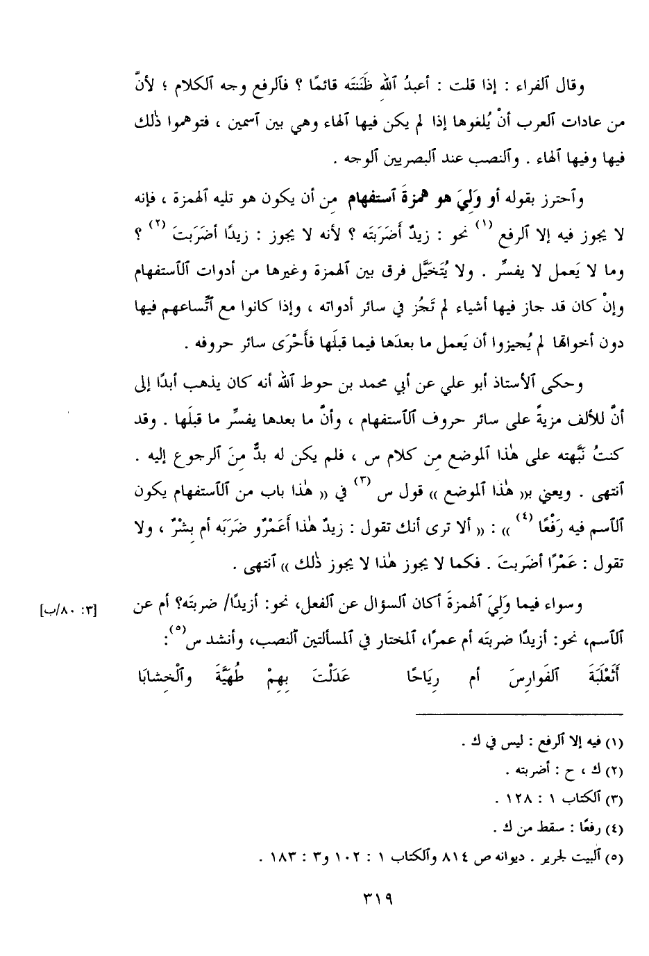 وحكى الأستاذ أبو علي عن أبي محمد بن حوط الله أنه كان يذب أبدًا إلى أن للألف مزية على سائر حروف الاستفهام، وأن ما بعدها يفسر ما قبلها. وقد كنت نبهته على هذا الموضع من كلام س، فلم يكن له بد من اللرجزع إليه. انتعي. ويعنى بـ"هذا الموضع" قول س في "هذا باب من الاستفهام يكون السم فيه رفعًا": "ألا ترى أنك تقول: زيد هذا أعمرو ضربه أم بشر، ولا تقول: عمرًا أضربت. فكما لا يجوز هذا لا يجوز ذلك" انتهى. وسواء فيما ولي الهمزة أكان السؤال عن الفعل،: أزيدًا / ضربته؟ أم عن الاسم، نحو: أزيدصا ضربته أم عمرًا، المختار في المسألتين النصب، وأنشد س: