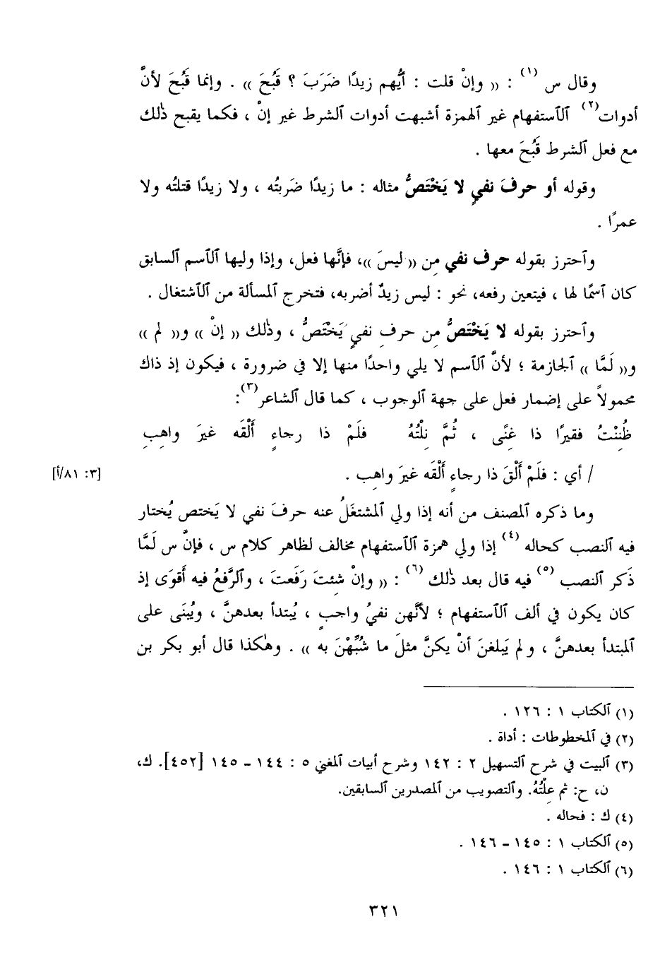 إذا ولي همزة الاستفهام مخالف لظاهر كلام س، فإن س لما ذكر النصب فيه قال بعد ذلك:"وإن شئت رفعت، والرفع فيه أقوى إذ كان يكون في ألف الاستفهام؛ لأنهن نفي واجب، يبتدأ بعدهن، ويبنى على المبتدأ بعدهن، ولم يبلغن أن يكن مثل ما شبهن به".