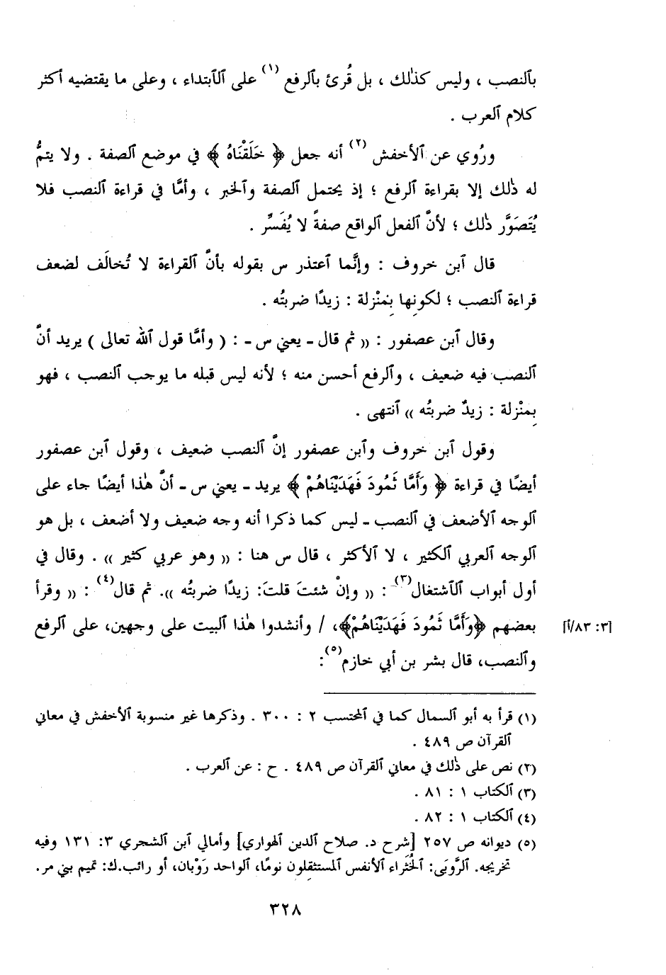 وقول ابن خروف وابن عصفور: إن النصب ضعيف، وقول ابن عصفور أيضا في قراءة {وأَمَّا ثَمُودُ فَهَدَيْنَاهُمْ} يريد-يعني س-أن هذا أيضا جاء على الوجه الأضعف في النصب-ليس كما أنه وجه ضعيف ولا أضعف، بل هو الوجه العربي الكثير، لا الأكثر،