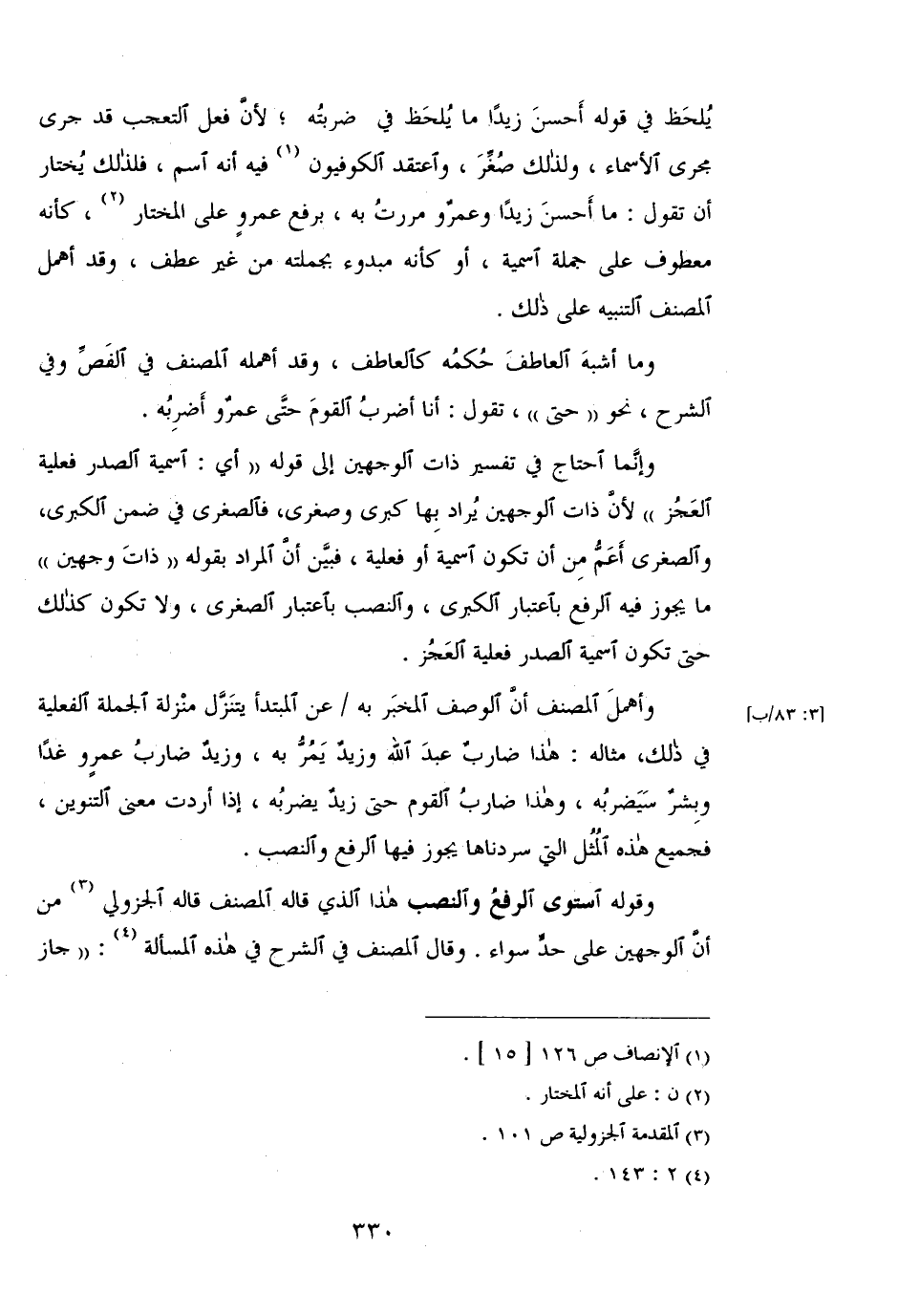 فبين أن المراد بقوله"ذات الوجهين"ما يجوز فيه الرفع باعتبار الكبرى، والنصب باعتبار الصغرى، ولا تكون كذلك حتى تكون اسمية الصدر فعليه العجز.