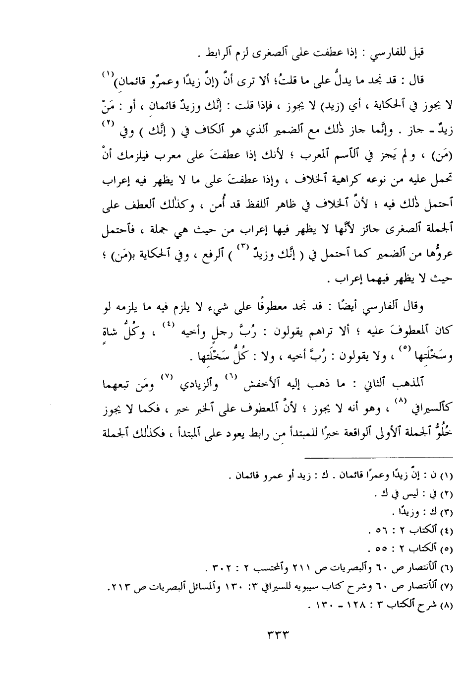 قيل للفارسي: إذا عطفت على الصغرى لزم الرابط.