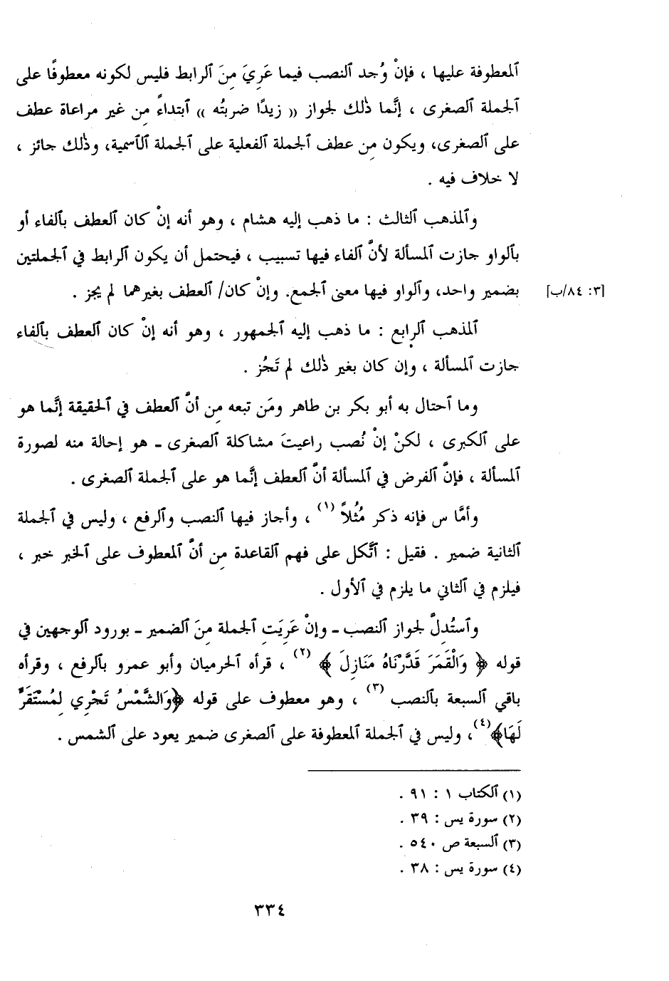 وما احتال به أبو بكر بن طاهر ومن تبعه من أن العطف في الحقيقة إنما هو على الكبرى، لكن إن نصب راعيت مشاكلة الصغرى- هو إحالة منه لصورة المسألة، فإن الفرض في المسألة أن العطف إنما هو على الجملة الصغرى.