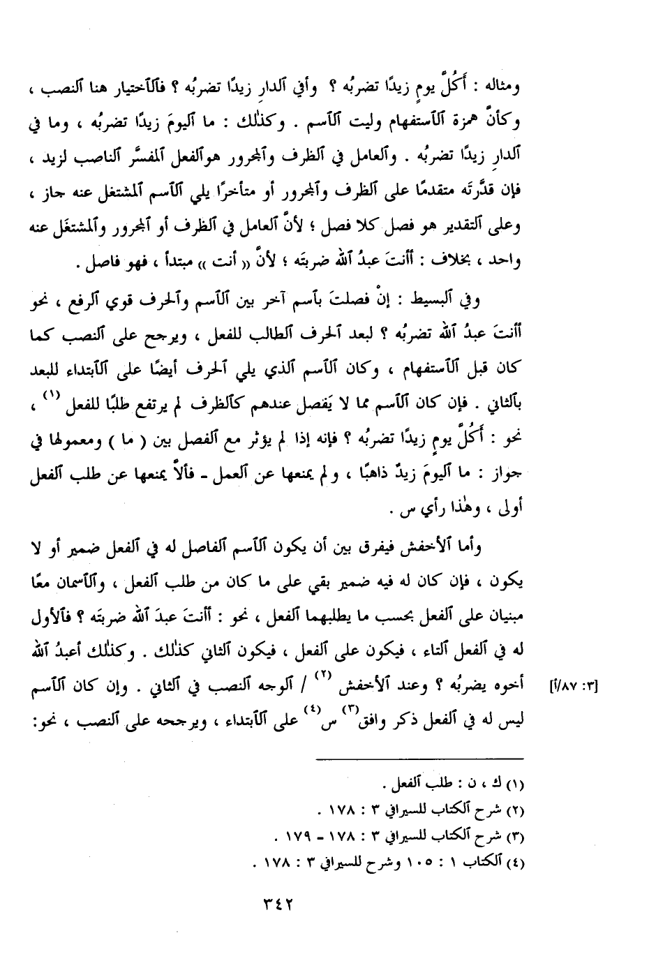 وفي البسيط: إن فصلت باسم آخر بين الاسم والحرف قوي الرفع، نحو أأنت عبد الله تضربه؟ لبعد الحرف الطالب للفعل، ويرجح على النصب كما كان قبل الاستفهام، وكان الاسم الذي يلي الحرف أيضًا على الابتداء للبعد بالثاني. فإن كان الاسم مما لا يفصل عندهم كالظرف لم يرتفع طلبًا للفعل، نحو: أكل يوم زيدًا تضربه؟ فإنه إذا لم يؤثر مع الفصل بين (ما) ومعمولها في جواز: ما اليوم زيد ذاهبًا، ولم يمنعها عن العمل _فألا يمنعها عن طلب الفعل أولى، وهذا رأي س.