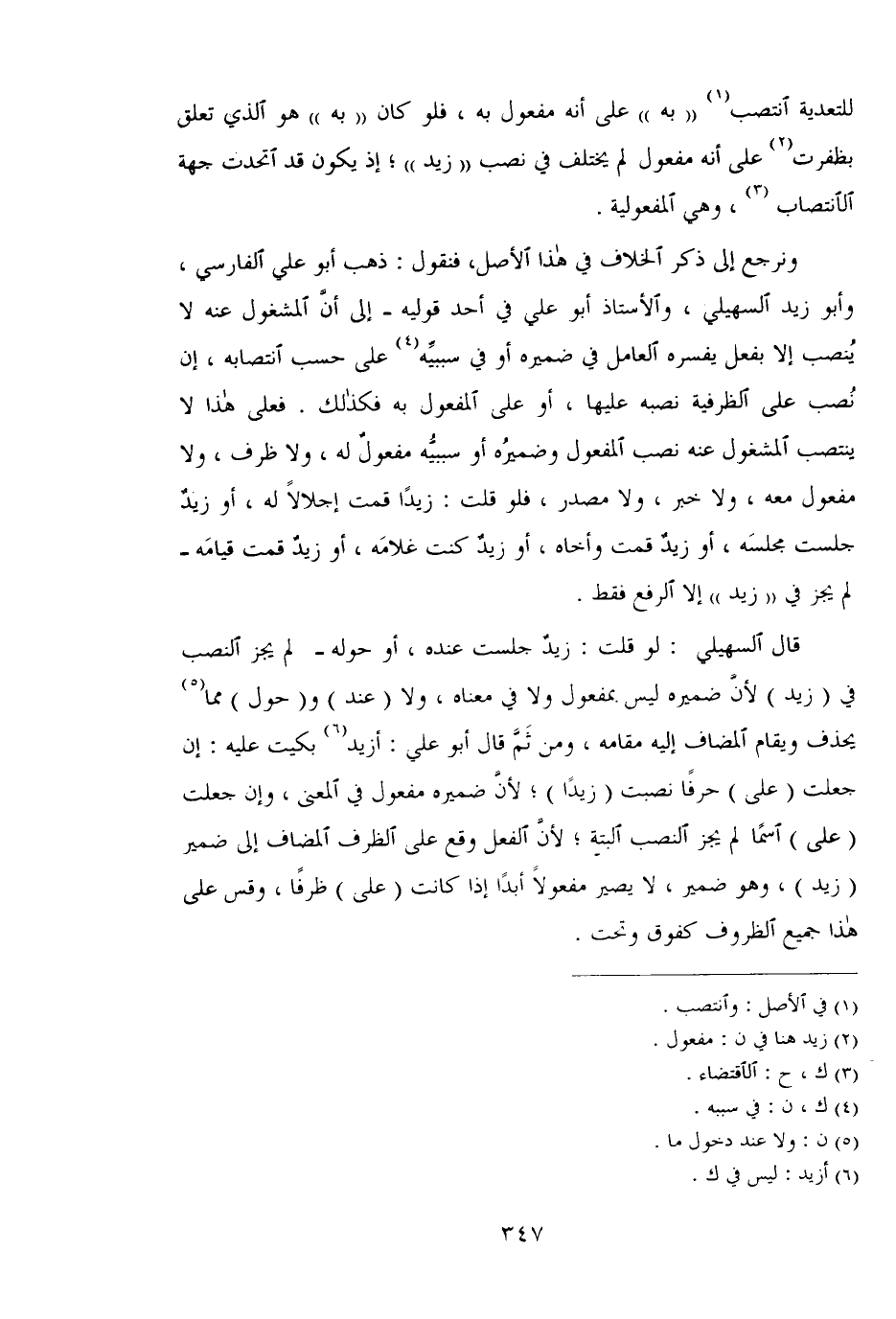 قال السهيلي: لو قلت: زيد جلست عنده، أو حوله _لم يجز النصب في (زيد) لأن ضميره ليس بمفعول ولا في معناه، ولا (عند) و (حول) مما يحذف ويقام المضاف إليه مقامه، ومن ثم قال أبو علي: أزيد بكيت عليه: إن جعلت (علي) حرفًا نصبت (زيدًا)؛ لأن ضميره مفعول في المعنى، وإن جعلت (علي) اسمًا لم يجز النصب البتة؛ لأن الفعل وقع على الظرف المضاف إلى ضمير (زيد)، وهو ضمير، لا يصير مفعولًا أبدًا إذا كانت (على) ظرفًا، وقس على هذا جميع الظروف كفوق وتحت.