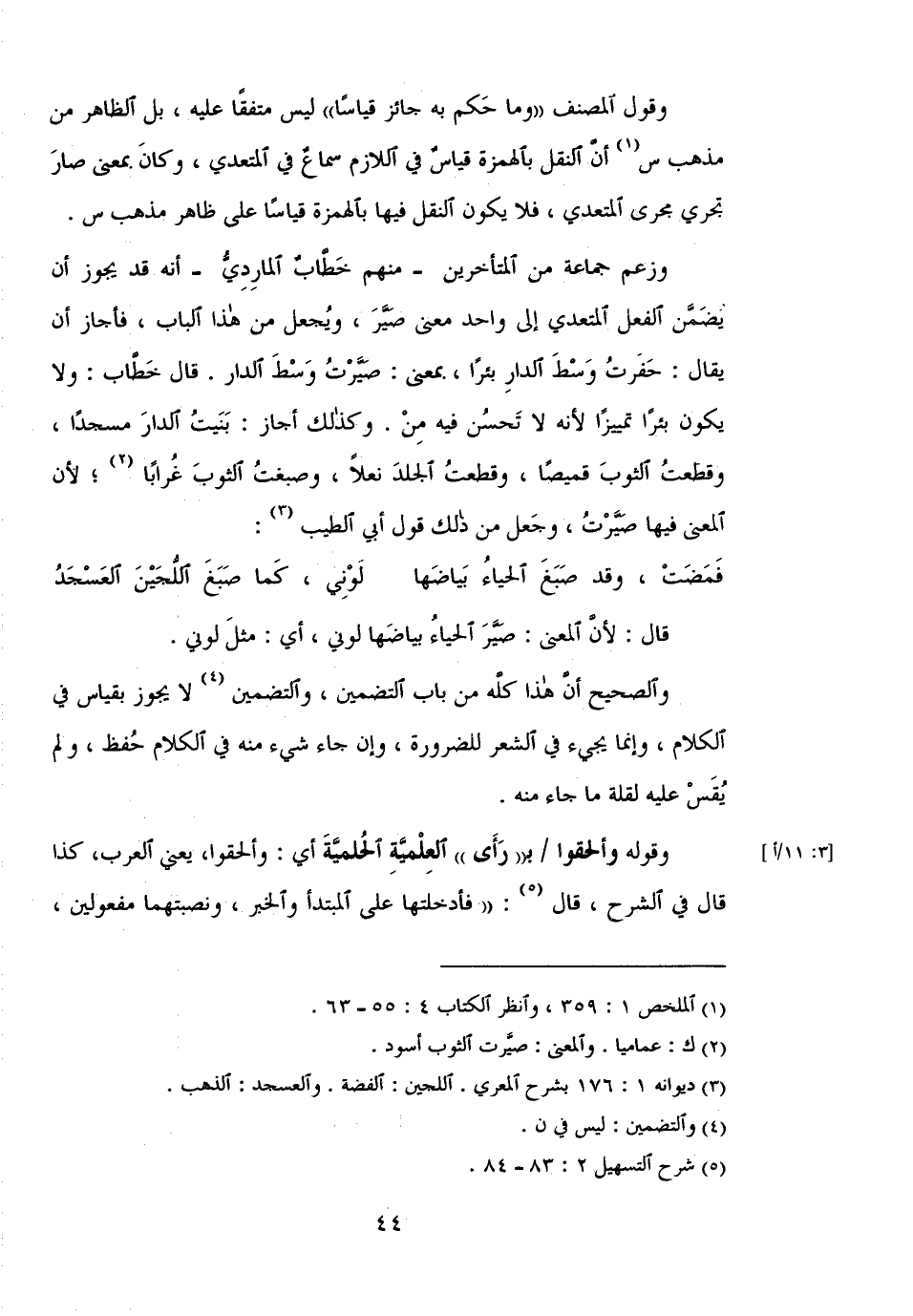 وزعم جماعة من المتأخرين -منهم خطاب الماردي - أنه قد يجوز أن يضمن الفعل المتعدي إلى واحد معنى صير، ويجعل من هذا الباب، فأجاز أن يقال: حفرت وسط الدار بئرًا، بمعنى: صيرت وسط الدار. قال خطاب: ولا يكون بئرًا تمييزًا لأنه لا تحسن فيه من. وكذلك أجاز: بنيت الدار مسجدًا، وقطعت الثوب قميصًا، وقطعت الجلد نعلًا، وصبغت الثوب غرابًا؛ لأن المعنى فيها صيرت، وجعل من ذلك قول أبي الطيب: