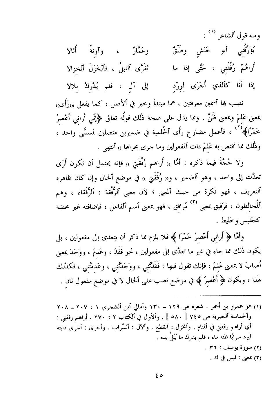 وأما {إِنِّي أَرَانِي أَعْصِرُ خَمْراً} فلا يلزم مما ذكر أن يتعدى إلى مفعولين، بل يكون ذلك مما جاء في غير ما تعدى إلى مفعولين، نحو فقد، وعدم، ووجد بمعنى أصاب لا بمعنى علم، فإنك تقول فيها: فقدتني، ووجدتني، وعدمتني، فكذلك هذا، ويكون {أَعْصِرُ} في موضع نصب على الحال لا في موضع مفعول ثان