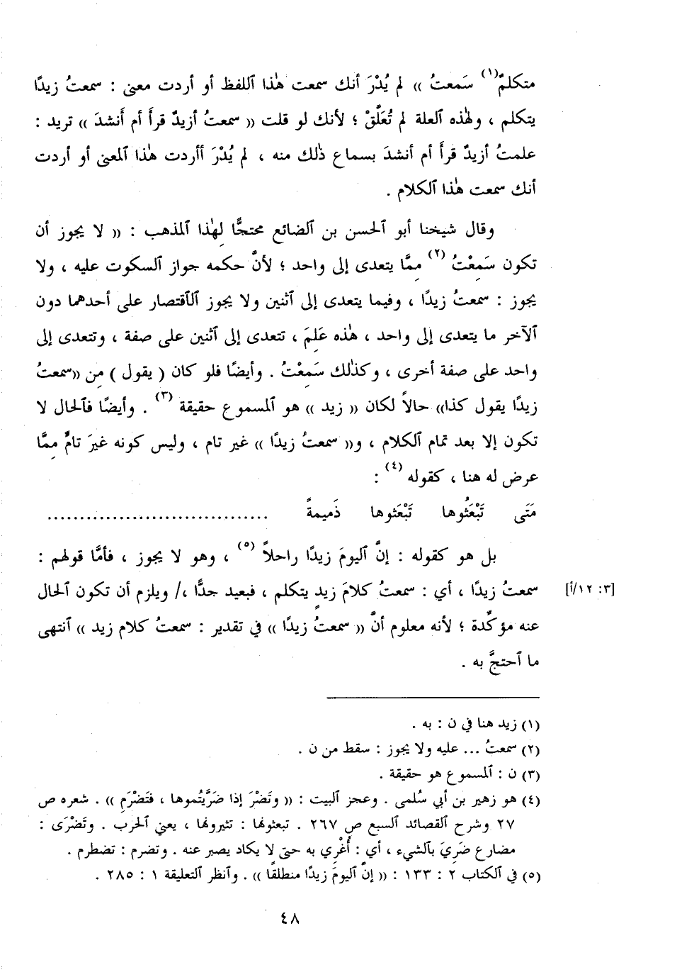 وقال شيخنا أبو الحسن بن الضائع محتجًا لهذا المذهب: "لا يجوز أن تكون سمعت مما يتعدى إلى واحد؛ لأن حكمه جواز السكوت عليه، ولا يجوز: سمعت زيدًا، وفيما يتعدى إلى اثنين ولا يجوز الاقتصار على أحدهما دون الآخر ما يتعدى إلى واحد، هذه علم، تتعدى إلى اثنين على صفة، وتتعدى إلى واحد على صفة أخرى، وكذلك سمعت. وأيضًا فلو كان (يقول) من "سمعت زيدًا يقول كذا" حالًا لكان "زيد" هو المسموع حقيقة. وأيضًا فالحال لا تكون إلا بعد تمام الكلام، و"سمعت زيدًا" غير تام، وليس كونه غير تام مما عرض له هنا، كقوله: