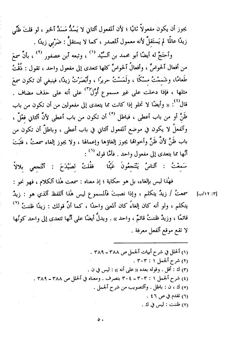 واحتج له أيضًا أبو محمد بن السيد، وتبعه ابن عصفور، بأن سمع من أفعال الحواس، وأفعال الحواس كلها تتعدى إلى مفعول واحد، تقول: ذقت طعامًا، وشممت مسكًا، ولمست حريرًا، وأبصرت زيدًا، فينبغي أن تكون سمع مثلها، فإذا دخلت على غير مسموع أول على أنه على حذف مضاف. قال: "وأيضًا لا تخلو إذا كانت مما يتعدى إلى مفعولين من أن تكون من باب ظن أو من باب أعطى، فباطل أن تكون من باب أعطى لأن الثاني فعل، والفعل لا يكون في موضع المفعول الثاني في باب أعطى، وباطل أن تكون من باب ظن لأن ظن وأخواتها يجوز إلغاؤها وإعمالها، ولا يجوز إلغاء سمعت، فثبت أنها مما يتعدى إلى مفعول واحد. فأما قوله: