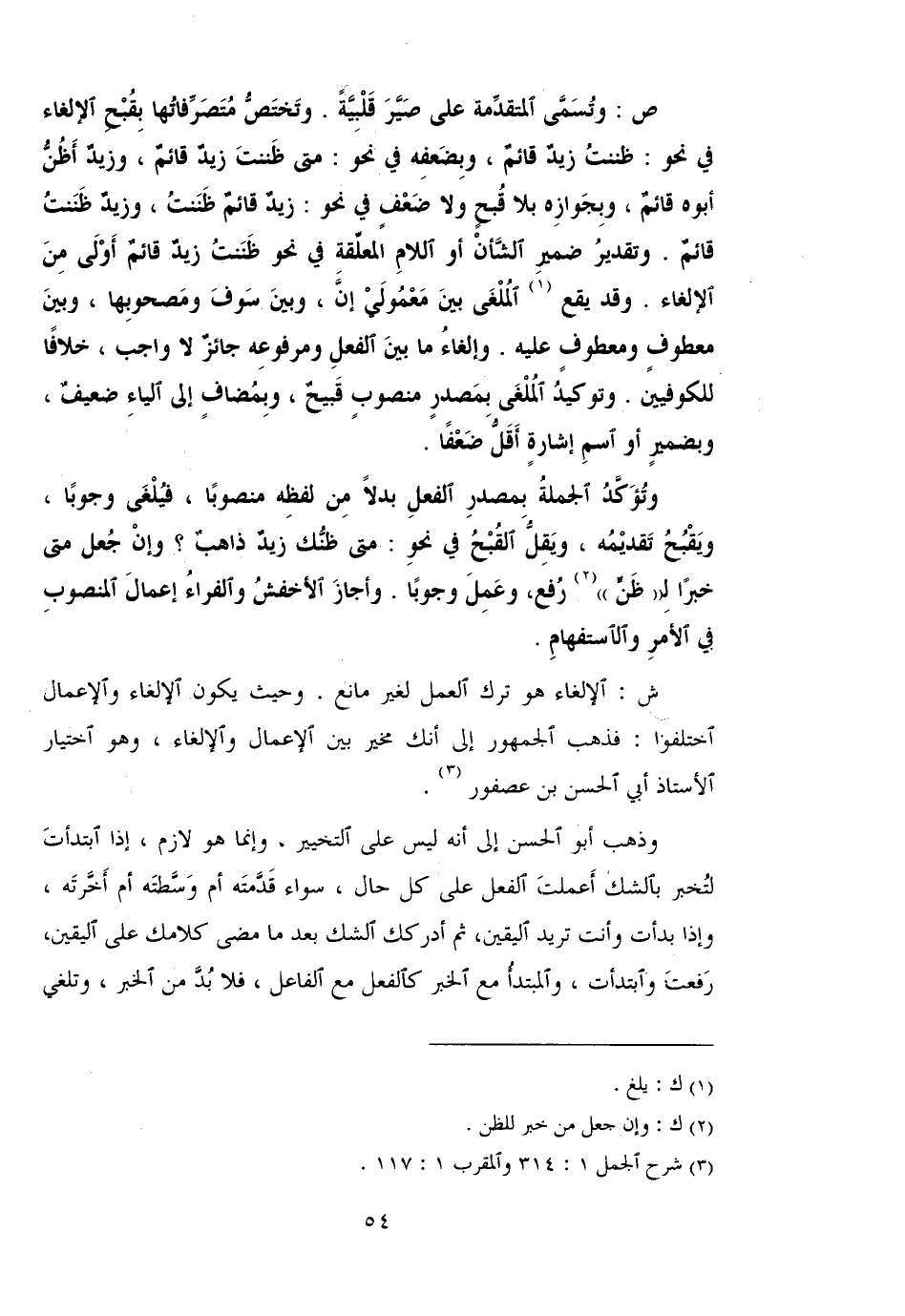ش: الإلغاء هو ترك العمل لغير مانع. وحيث يكون الإلغاء والإعمال اختلفوا: فذهب الجمهور إلى أنك مخير بين الأعمال والإلغاء، وهو اختيار الأستاذ أبي الحسن بن عصفور.