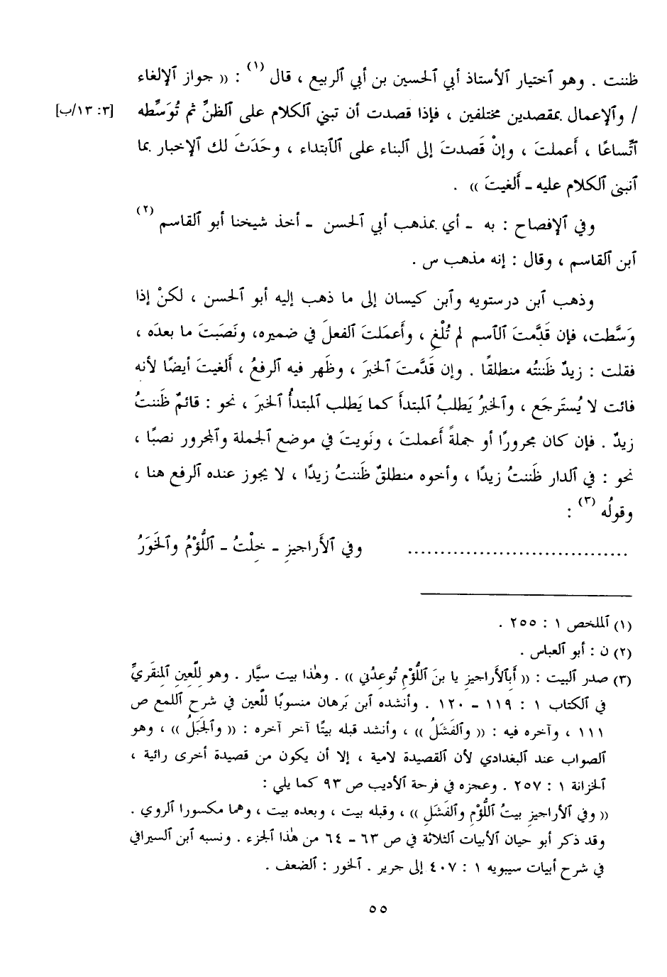 ظننت. وهو اختيار الأستاذ أبي الحسين بن أبي الربيع، قال: "جواز الإلغاء/ والإعمال بمقصدين مختلفين، فإذا قصدت أن تبني الكلام على الظن ثم توسطه اتساعًا، أعملت، وإن قصدت إلى البناء على الابتداء، وحدث لك الإخبار بما أنبنى الكلام عليه - ألغيت".