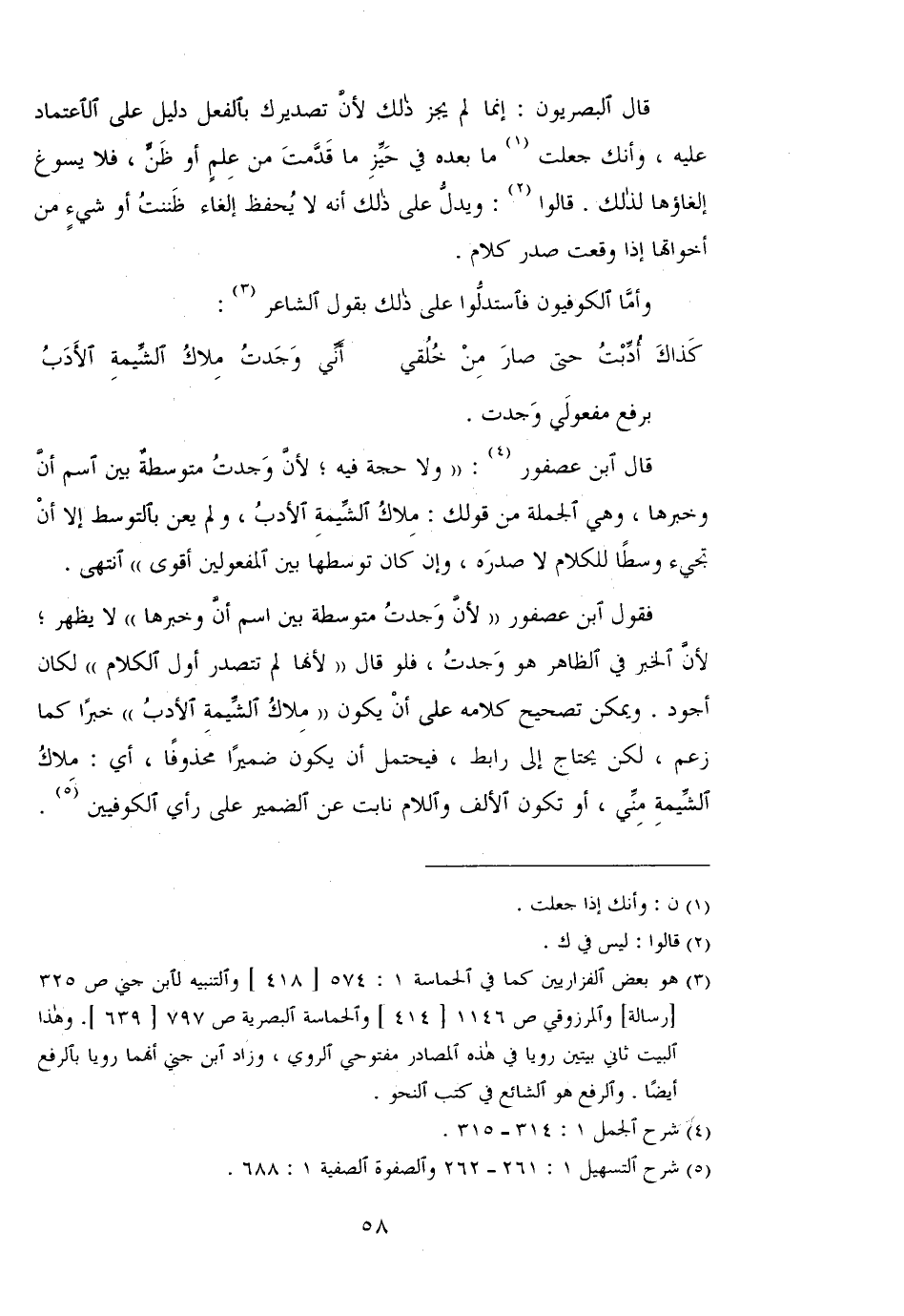 فقول ابن عصفور "لأن وجدت متوسطة بين اسم أن وخبرها" لا يظهر؛ لأن الخبر في الظاهر هو وجدت، فلو قال " لأنها لم تتصدر أول الكلام" لكان أجود. ويمكن تصحيح كلامه على أن يكون "ملاك الشيمة الأدب" خبرًا كما زعم، لكن يحتاج إلى رابط، فيحتمل أن يكون ضميرًا محذوفًا، أي: ملاك الشيمة مني، أو تكون الألف واللام نابت عن الضمير على رأي الكوفيين.