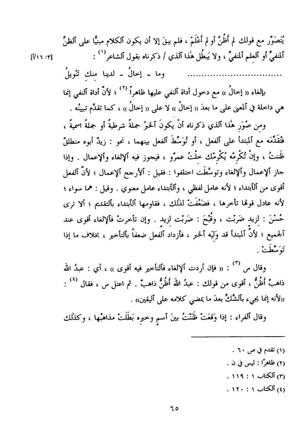 وقال س: «فإن أردت الإلغاء فالتأخير فيه أقوى»، أي: عبد الله ذاهب أظن، أقوى من قولك: عبد الله أظن ذاهب. ثم اعتل س، فقال: «لأنه إنما يجئ بالشك بعد ما يمضي كلامه على اليقين».