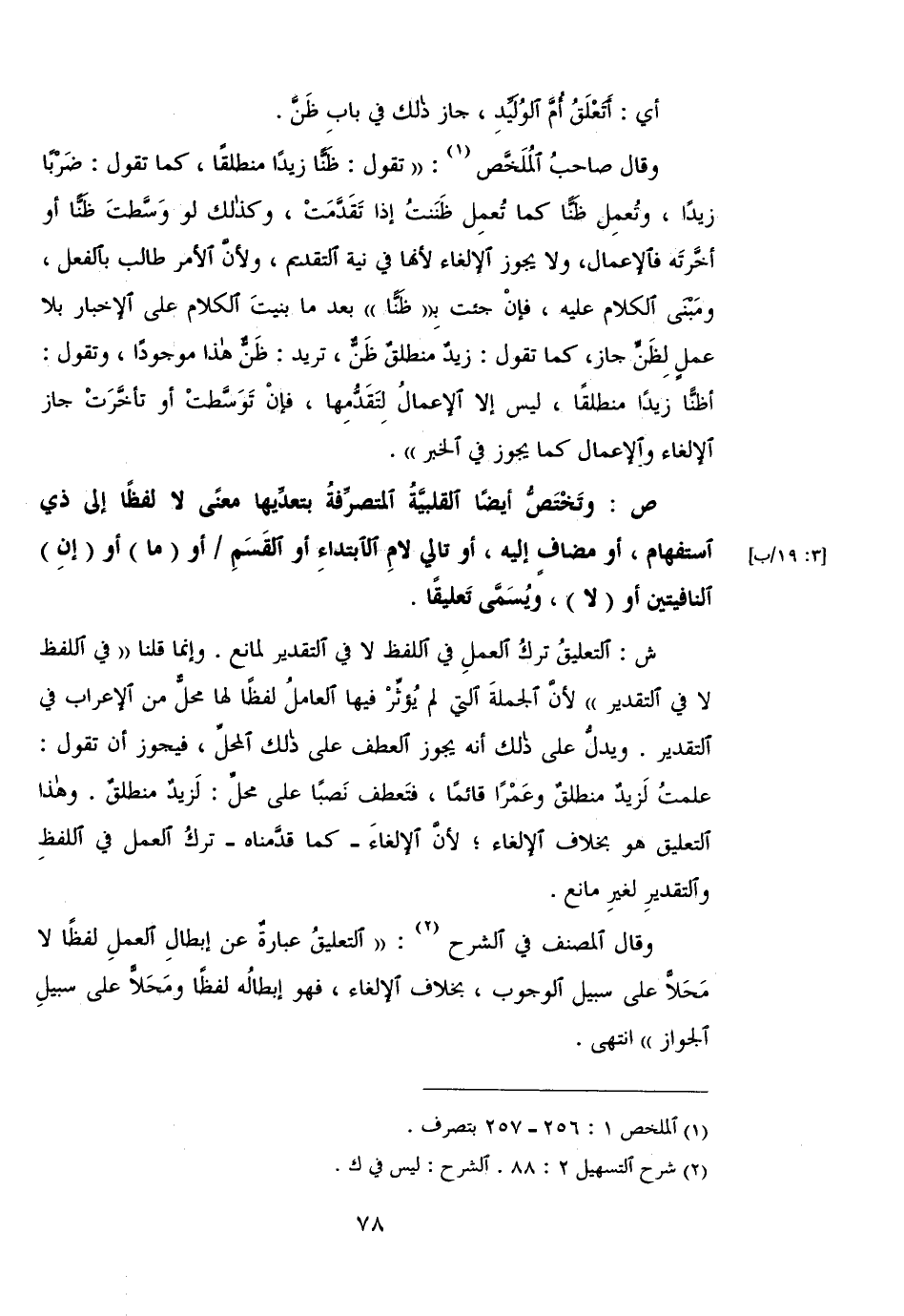 وتقول: أظنا زيدا منطلقا، ليس إلا الإعمال لتقدمها، فإن توسط أو تأخرت جاز الإلغاء والإعمال كما يجوز في الخبر".