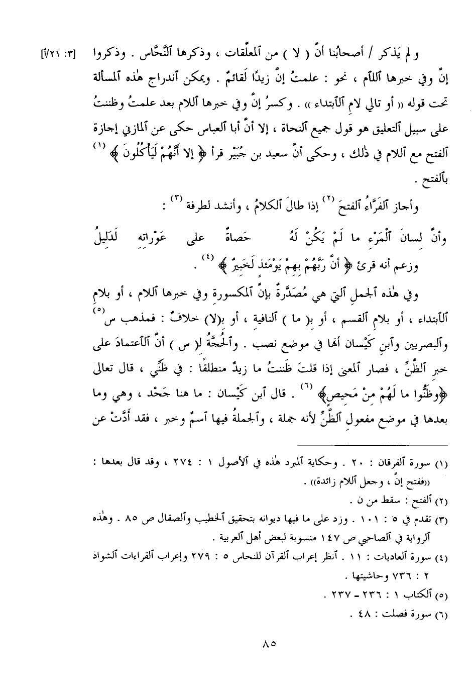 وفي هذه الجمل التي هي مصدرة بإن المكسورة وفي خبرها اللام، أو بلام الابتداء، أو بلام القسم، أو بـ (ما) النافية، أو بـ (لا) خلاف: فمذهب س والبصريين وابن كيسان أنها في موضع نصب. والحجة لـ (س) أن الاعتماد على خبر الظن، فصار المعنى إذا قلت ظننت ما زيد منطلقًا: في ظني، قال تعالى {وظَنُّوا مَا لَهُم مِّن مَّحِيصٍ}. قال ابن كيسان: ما هنا جحد، وهي وما بعدها في موضع مفعول الظن لأنه جملة، والجملة فيها اسم وخبر، فقد أدت عن