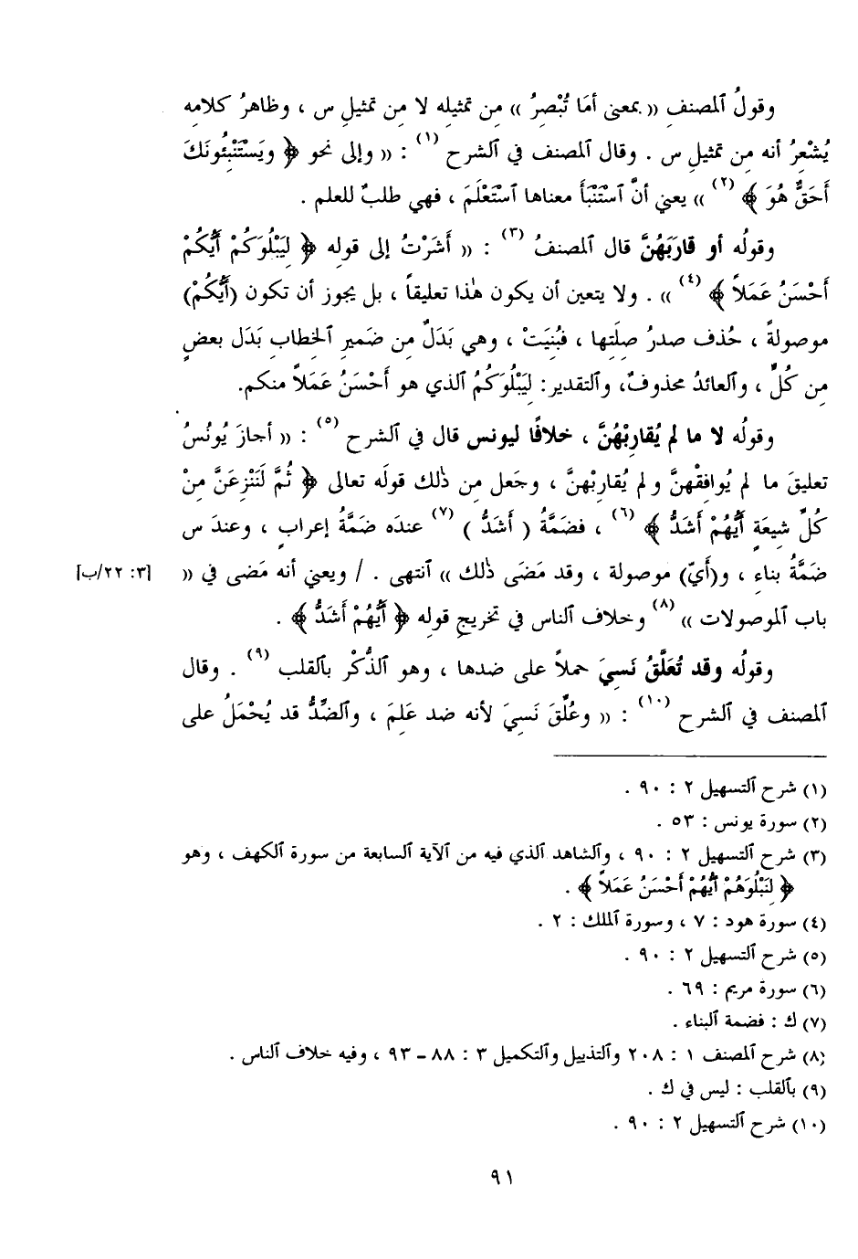 وقوله أو قاربهن قال المصنف: "أشرت إلى قوله {لِيَبْلُوَكُمْ أَيُّكُمْ أَحْسَنُ عَمَلاً} ". ولا يتعين ان يكون هذا تعليقًا، بل يجوز ان تكون {أَيُّكُمْ} موصولة، حذف صدر صلتها، فبنيت، وهي بدل من الخطاب بدل بعض من كل، والعائد محذوف، والتقدير: ليبلوكم الذي هو أحسن عملاً منكم. وقوله لا ما لم يقاربهن، خلافًا ليونس قال في الشرح: "أجاز يونس تعليق ما لم يوافقهن ولم يقاربهن، وجعل من ذلك قوله تعالى {ثُمَّ لَنَنزِعَنَّ مِنْ كُلِّ شِيعَةٍ أَيُّهُمْ أَشَدُّ}، فضمة (أشد) عنده ضمة إعراب، وعند س ضمة بناء و (أي) موصولة، وقد مضى ذلك" انتهى./ ويعنى أنه مضى في " [٣: ٢٢/ب] باب الموصولات" وخلاف الناس في تخريج قوله {أَيُّهُمْ أَشَدُّ}.