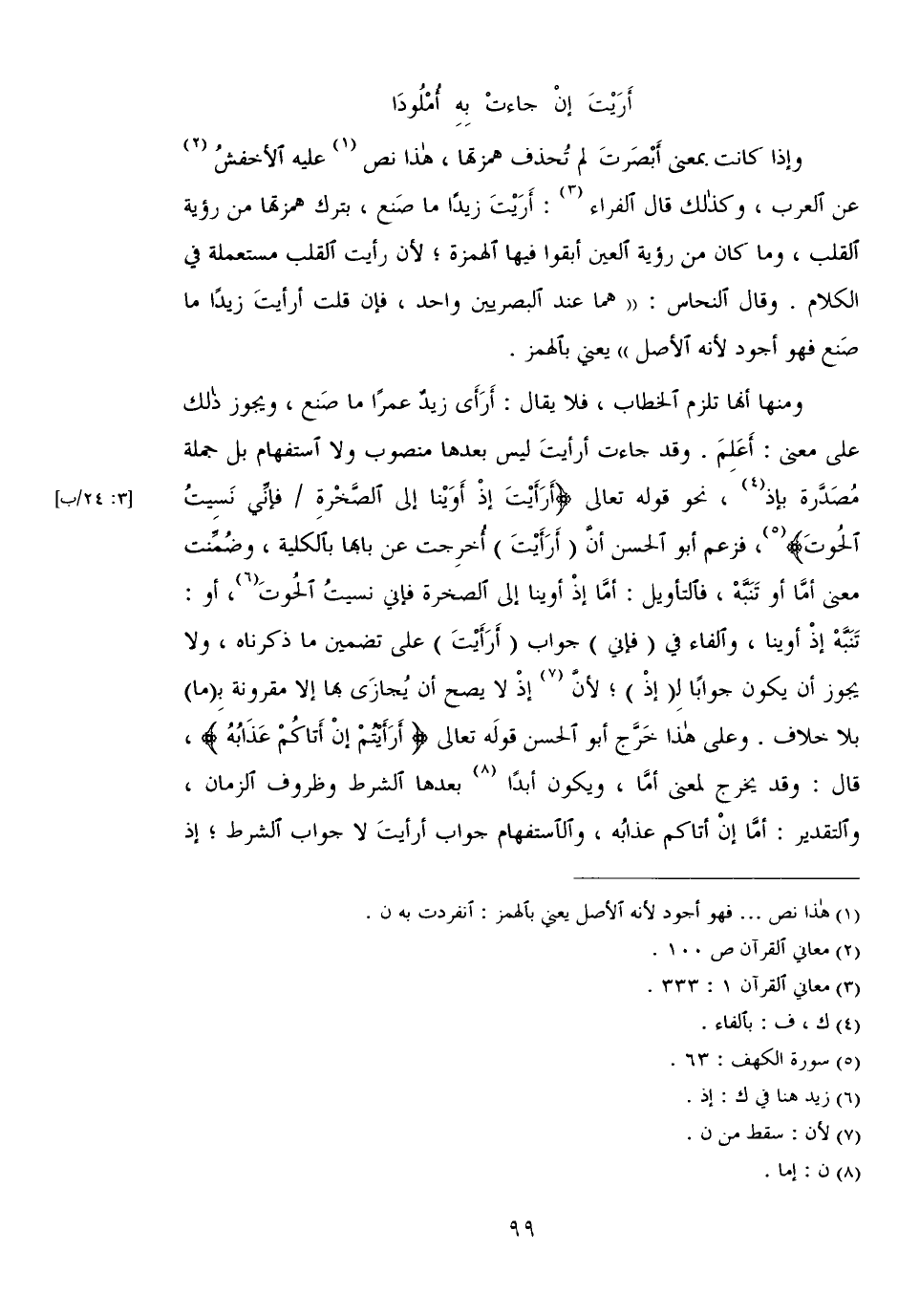 وإذا كانت بمعنى أبصرت لم تحذف همزتها، هذا نص عليه الأخفش عن العرب، وكذلك قال الفراء: أريت زيدًا ما صنع، بترك همزتها من رؤية القلب، وما كان من رؤية العين أبقوا فيها الهمزة؛ لأن رأيت القلب مستعملة في الكلام. وقال النحاس: "هما عند البصريين واحد، فإن قلت أرأيت زيدًا ما صنع فهو أجود لأنه الأصل" يعني بالهمز.